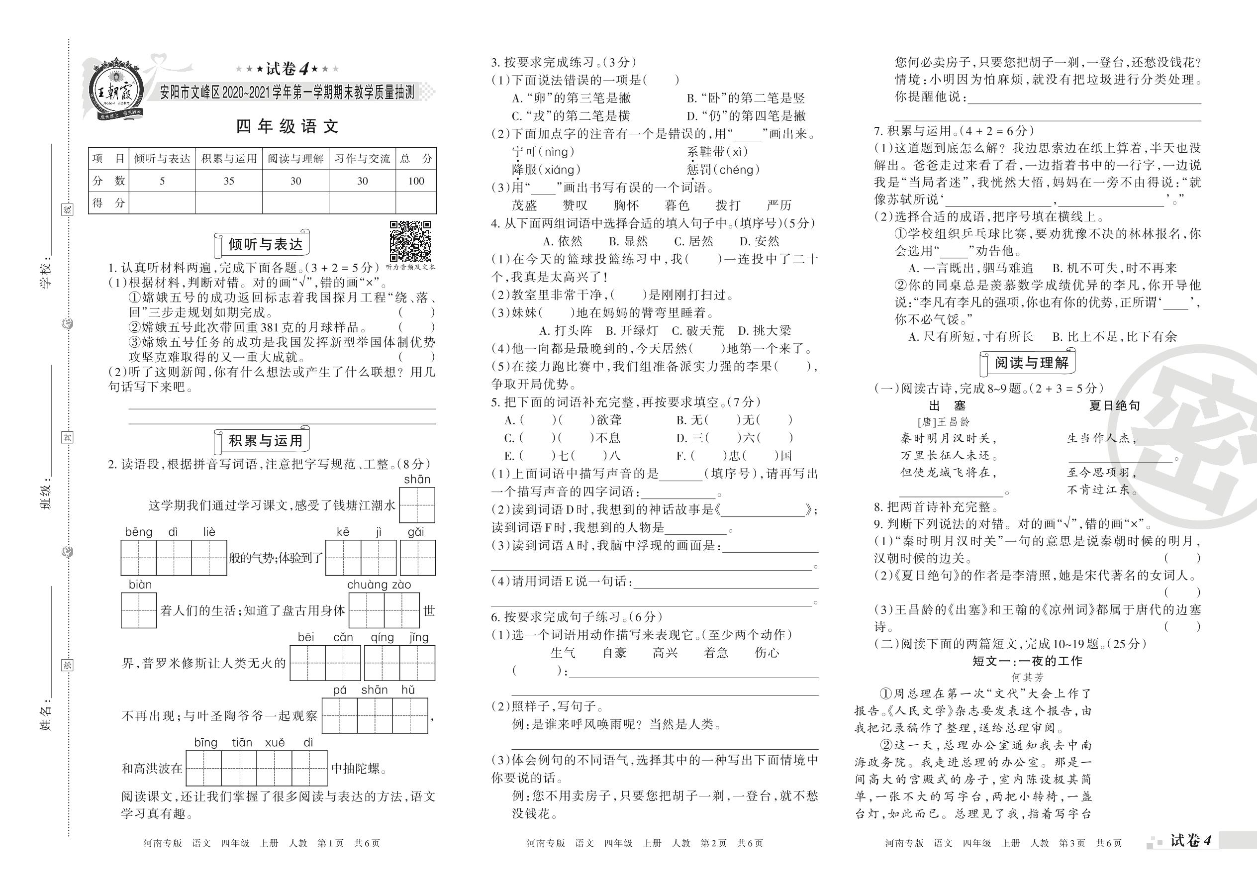 安阳市文峰区2020~2021学年第一学期期末教学质量抽测四年级语文(人教版)【4】