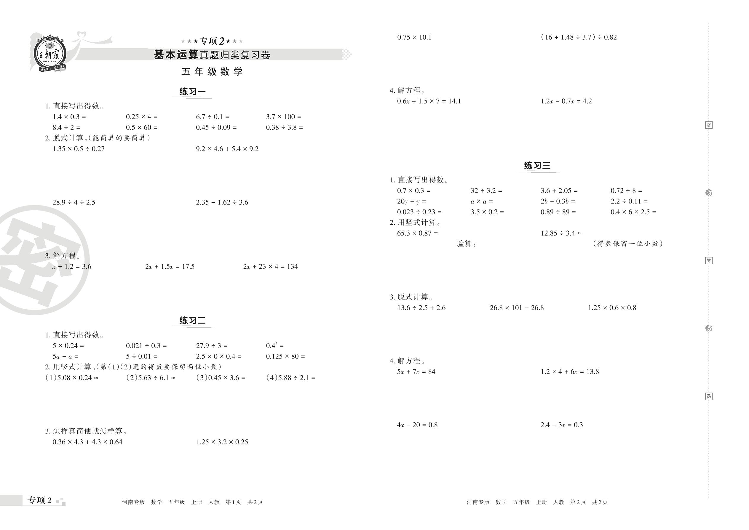 王朝霞期末专项卷——基本运算真题归类复习五年级上册数学(人教版)