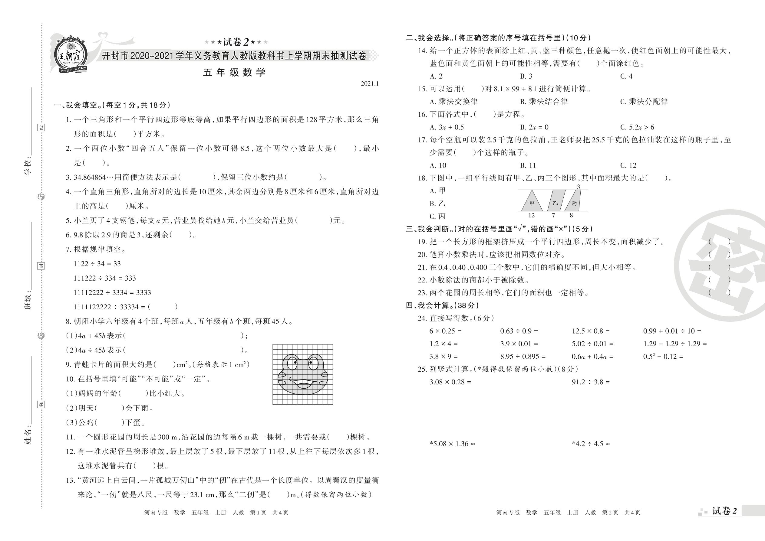 开封市2020~2021学年义务教育人教版教科书上学期期末抽测试卷五年级数学(人教版)【2】