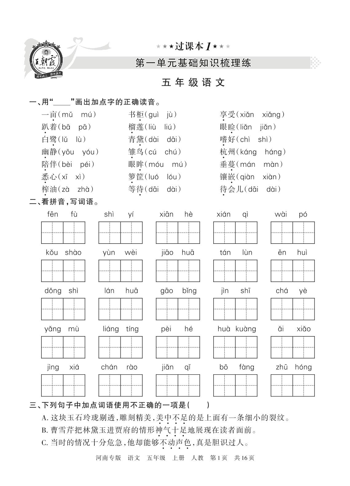 王朝霞期末过课本——第一单元基础知识梳理练五年级上册语文(人教版)