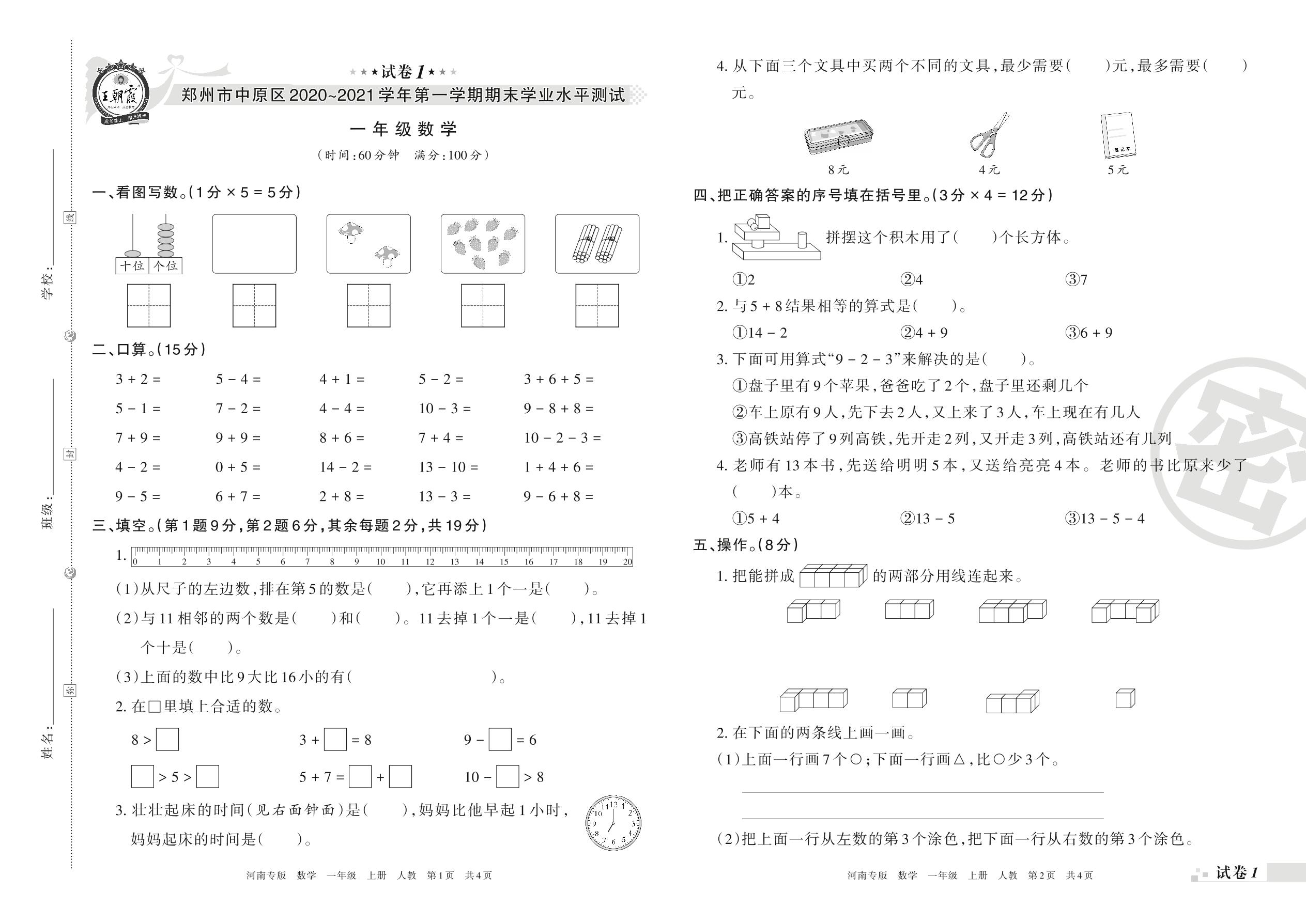 郑州市中原区2020~2021学年第一学期期末学业水平测试一年级数学(人教版)【1】