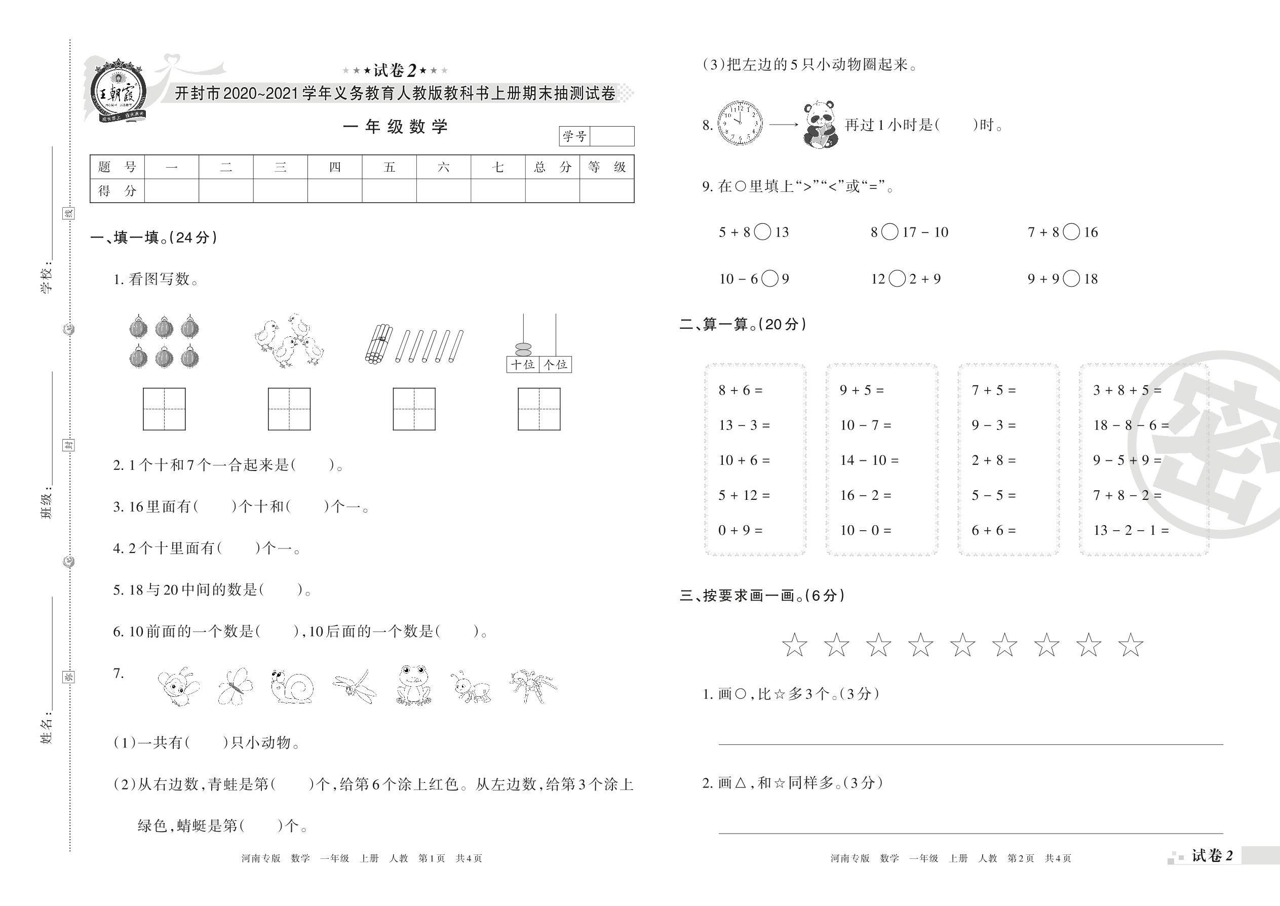 开封市2020~2021学年义务教育人教版教科书上册期末抽测试卷一年级数学(人教版)【2】