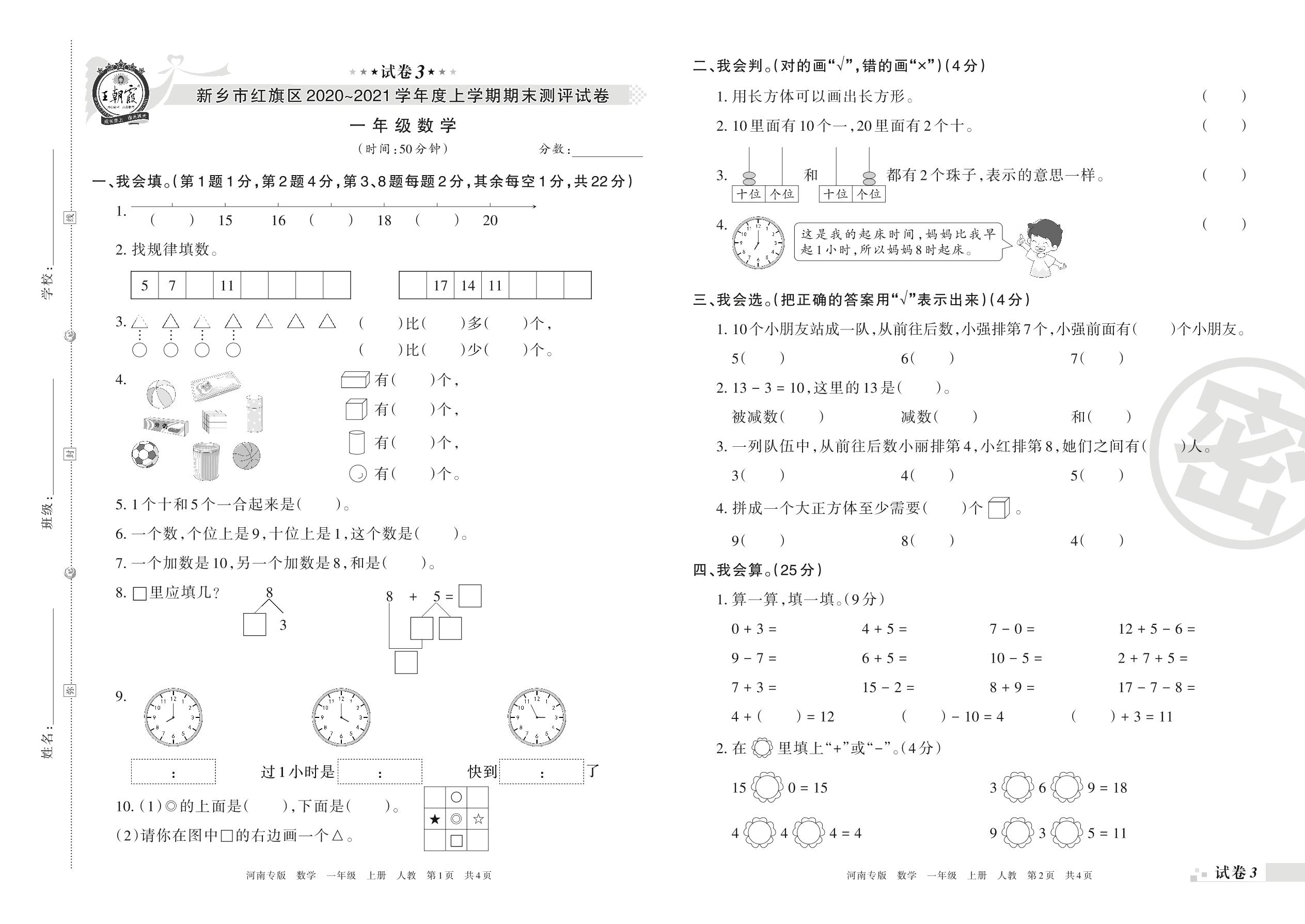 新乡市红旗区2020~2021学年度上学期期末测评试卷一年级数学(人教版)【3】