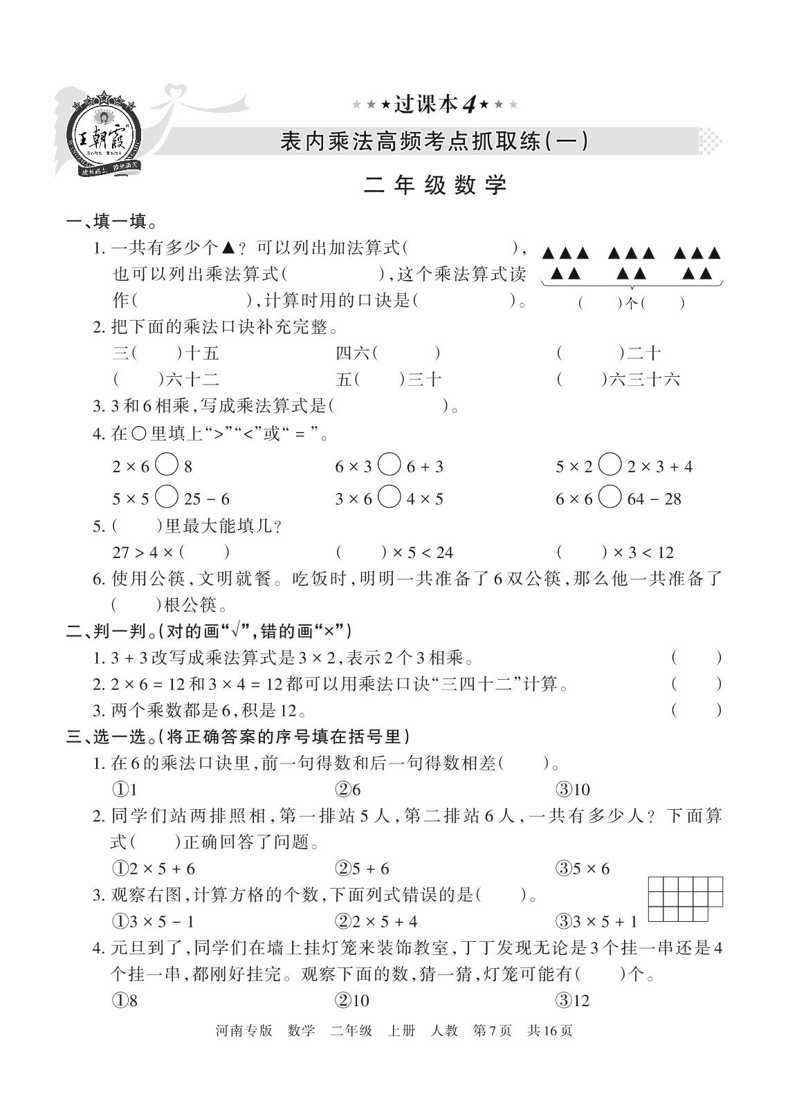 王朝霞期末过课本——表内乘法高频考点抓取练(一)二年级上册数学(人教版)
