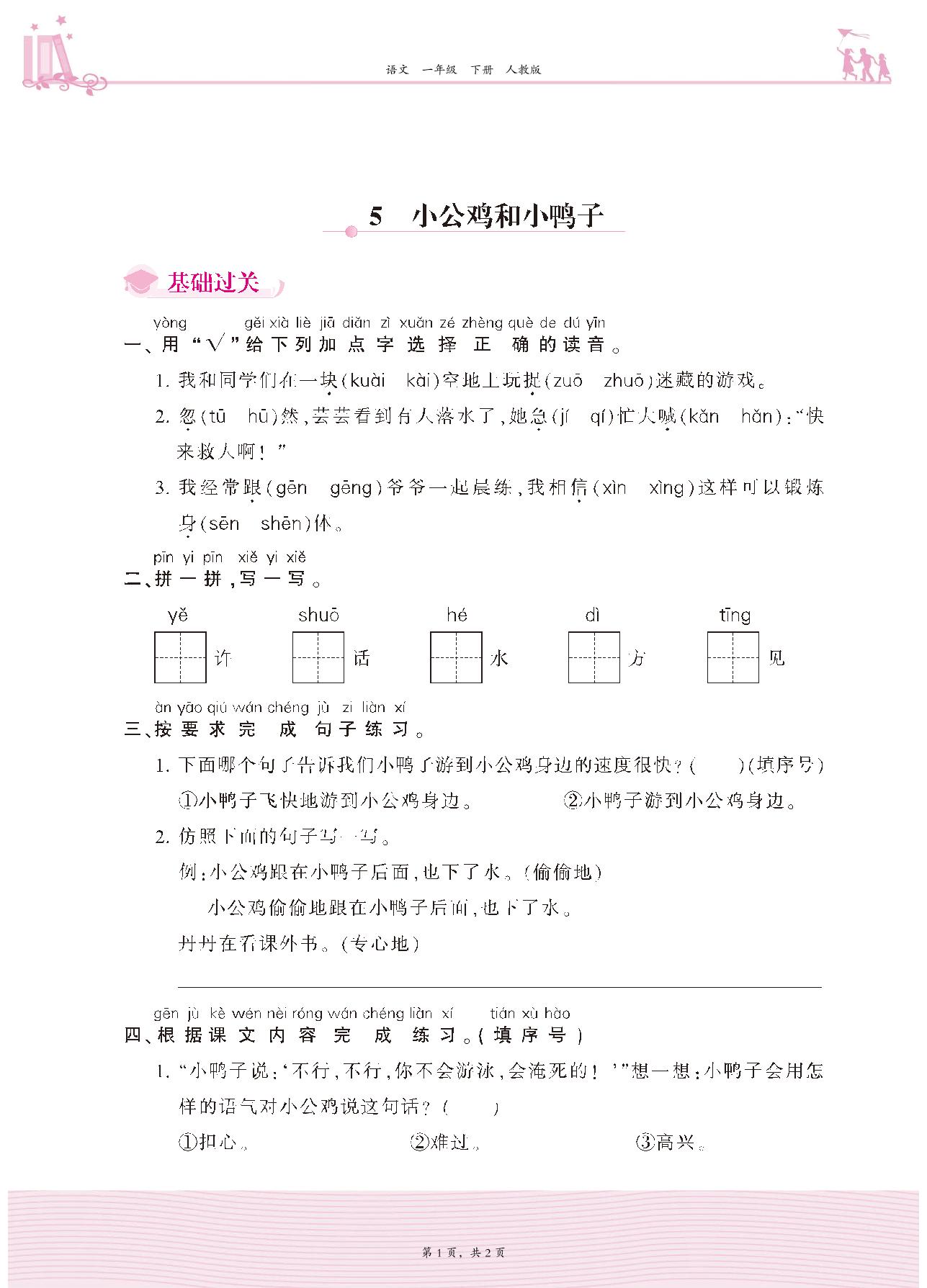 2021下册一年级语文人教版 第三单元 课文——5 小公鸡和小鸭子