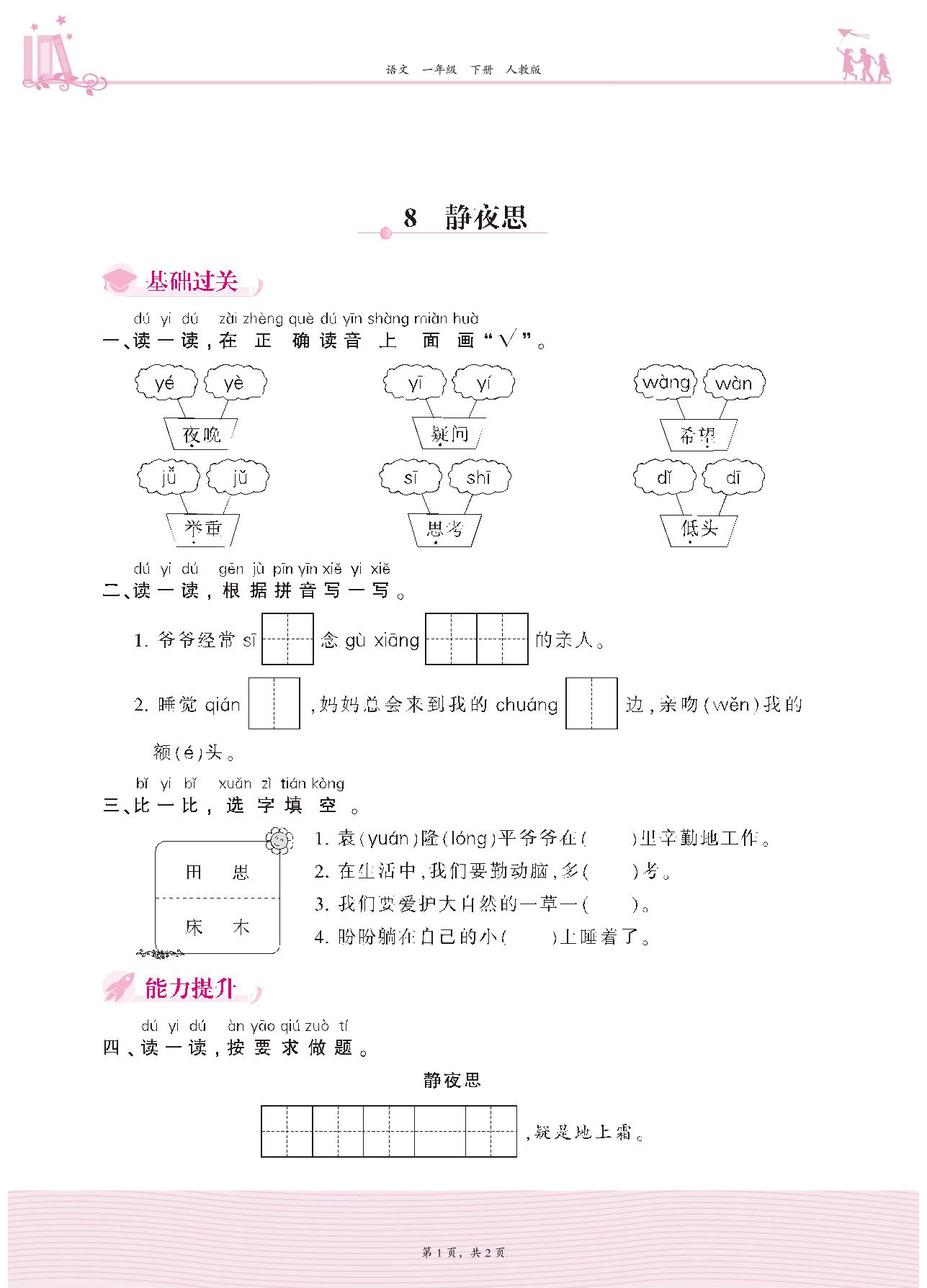 2021下册一年级语文人教版 第四单元 课文——8 静夜思