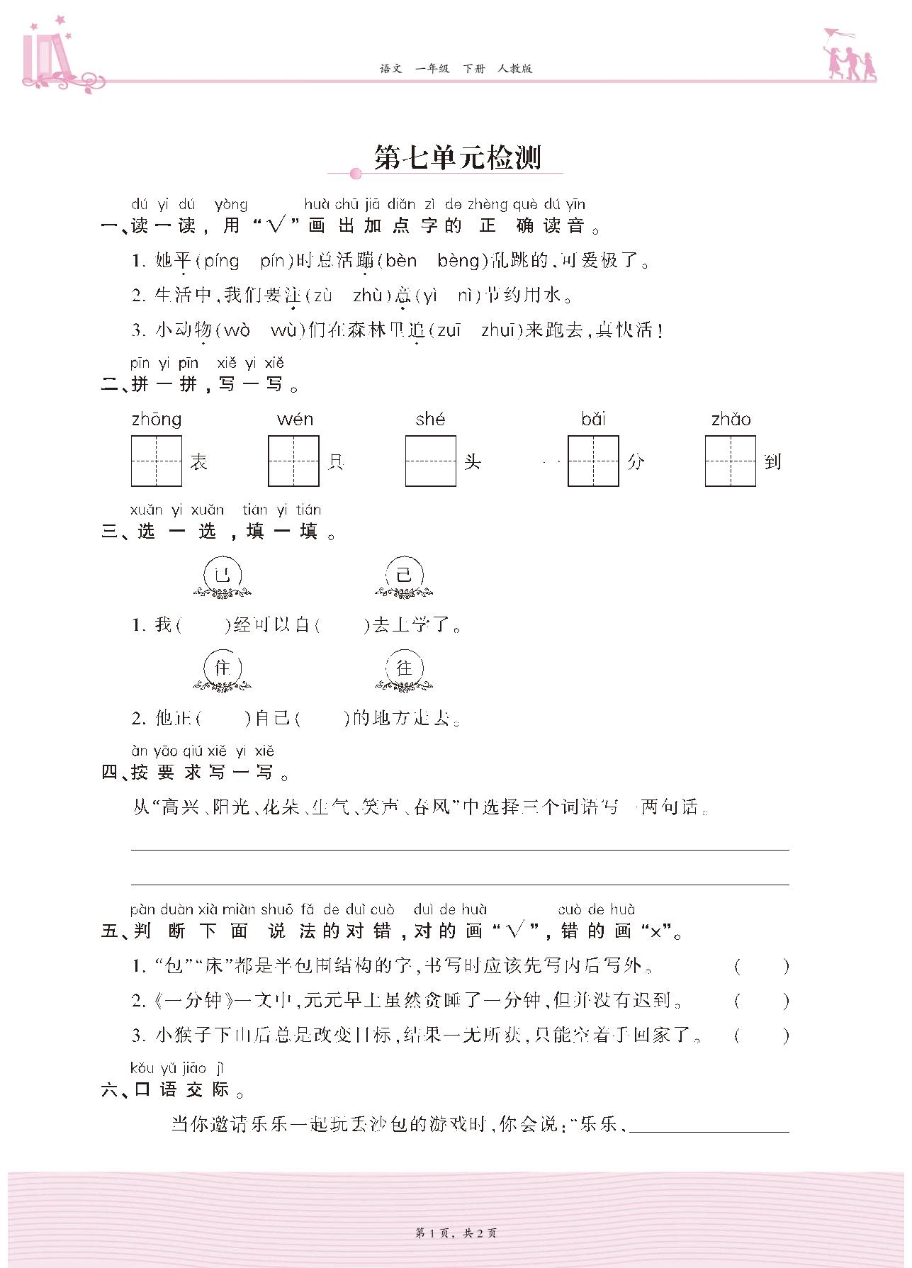 2021下册一年级语文人教版 第七单元检测