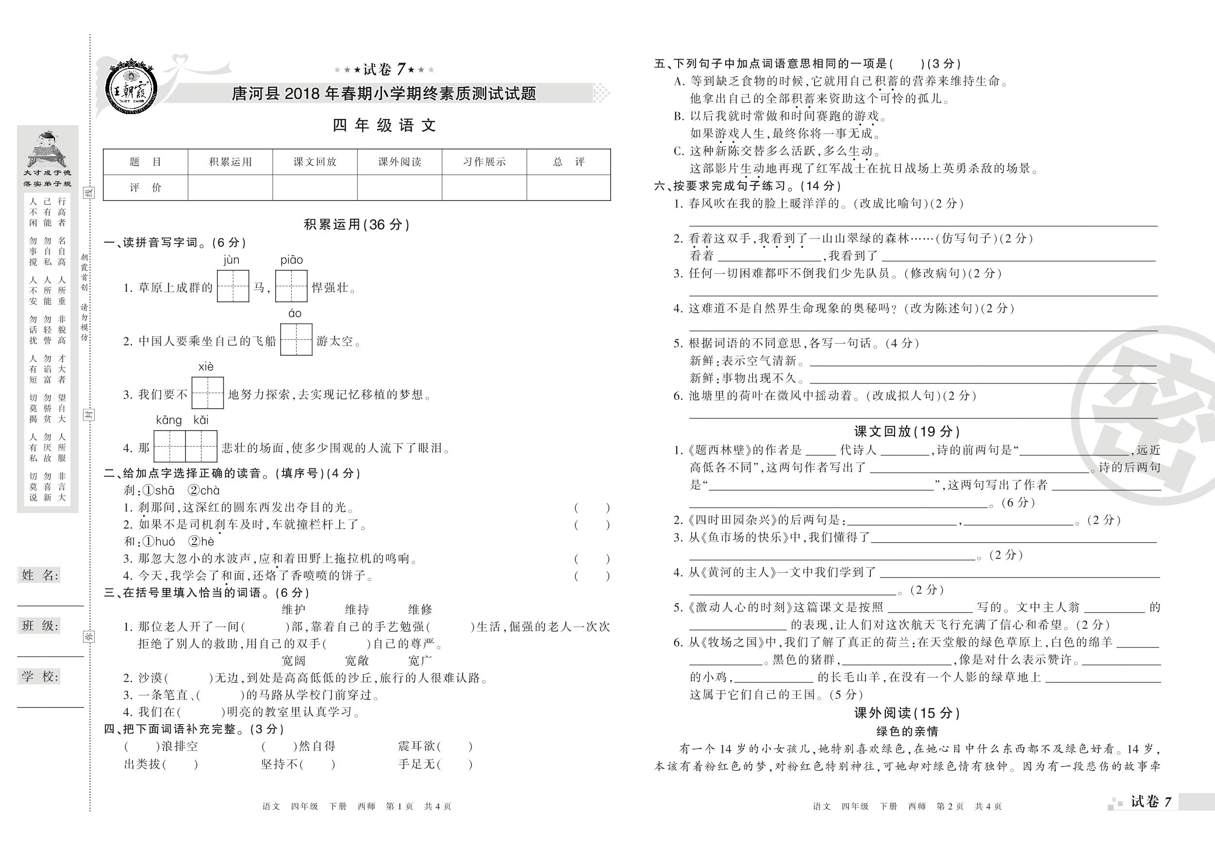 2017-2018学年第二学期南阳市唐河县四年级语文试卷(西师版)【7】