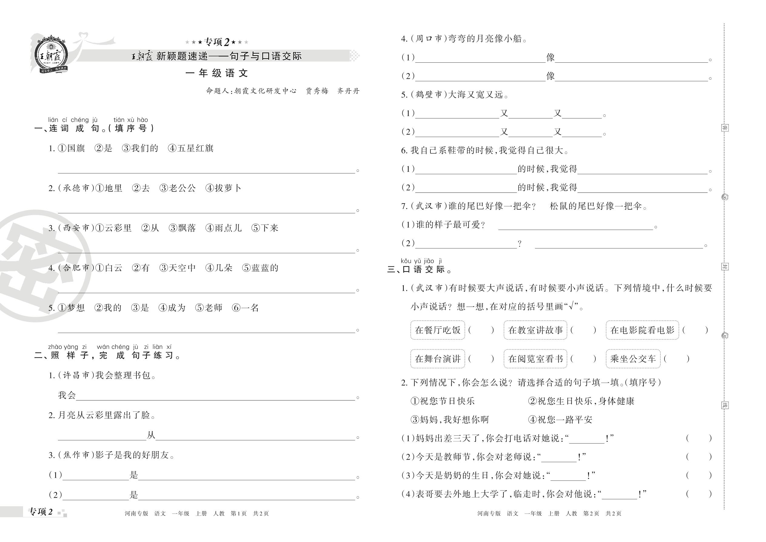 王朝霞期末专项卷——句子与口语交际一年级上册语文(人教版)