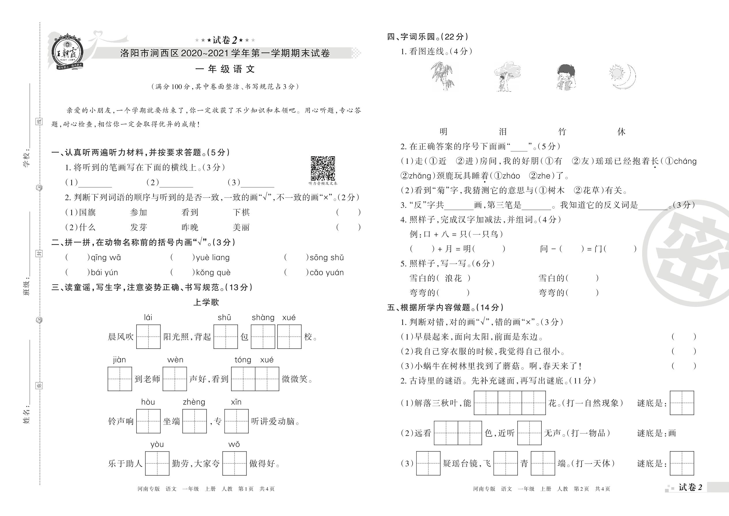 洛阳市涧西区2020~2021学年第一学期期末试卷一年级语文(人教版)【2】
