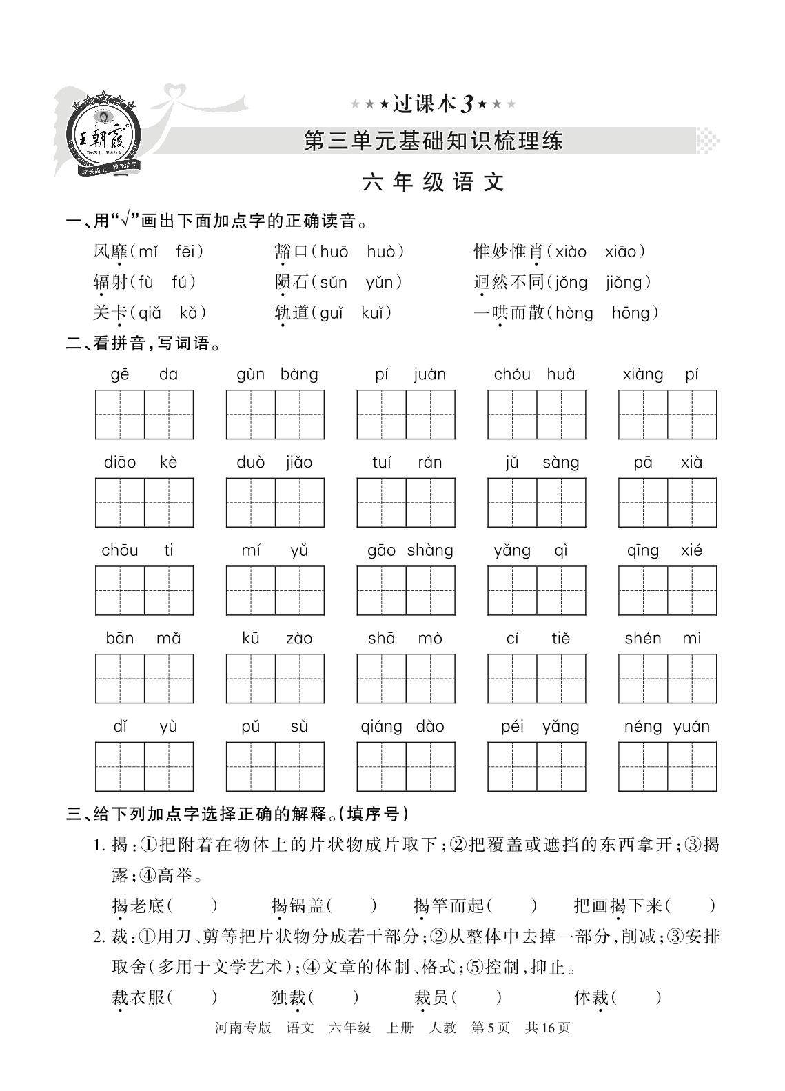 王朝霞期末过课本——第三单元基础知识梳理练六年级上册语文(人教版)