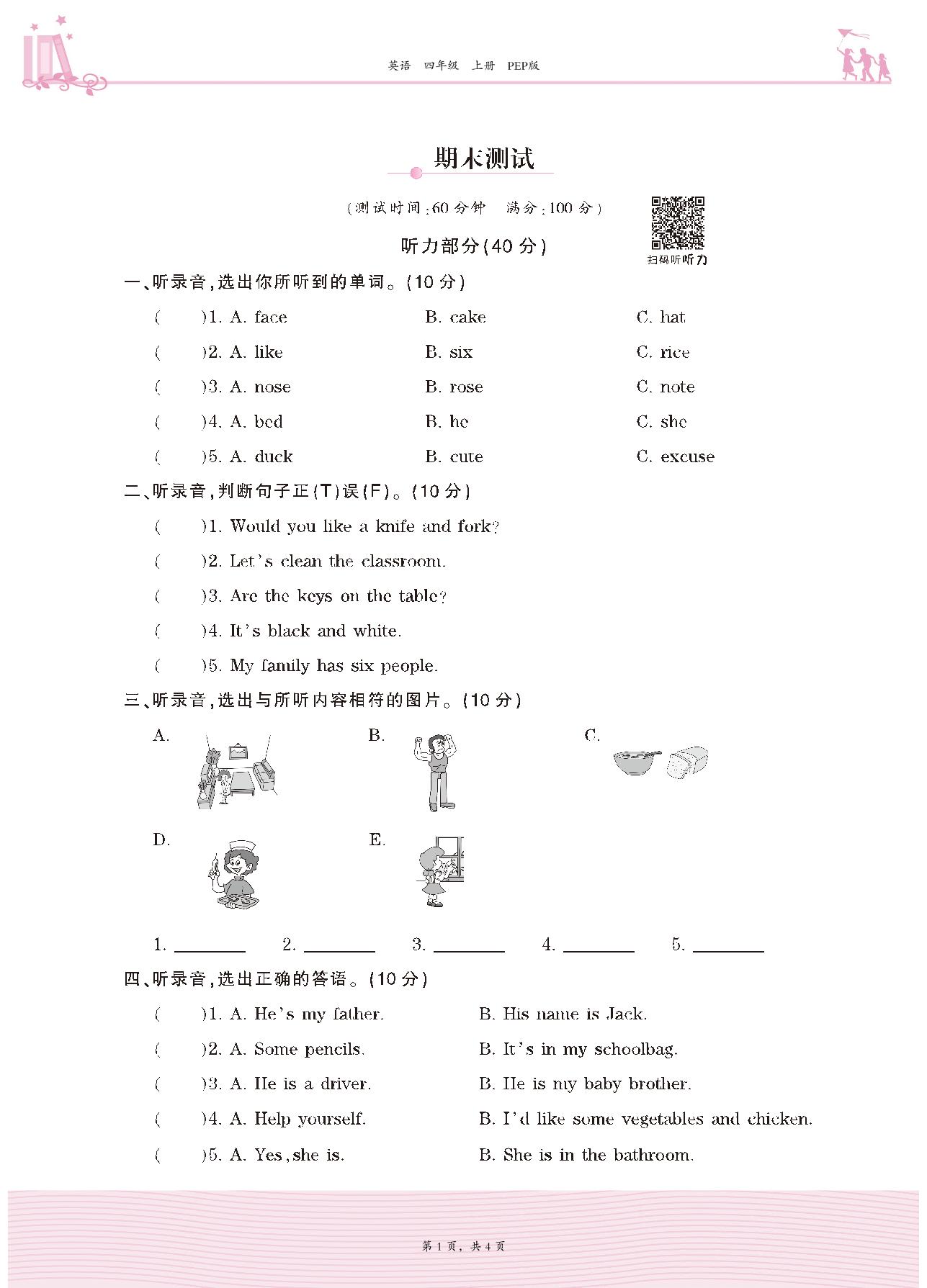 四年级英语人教PEP版(三起始)上册期末卷