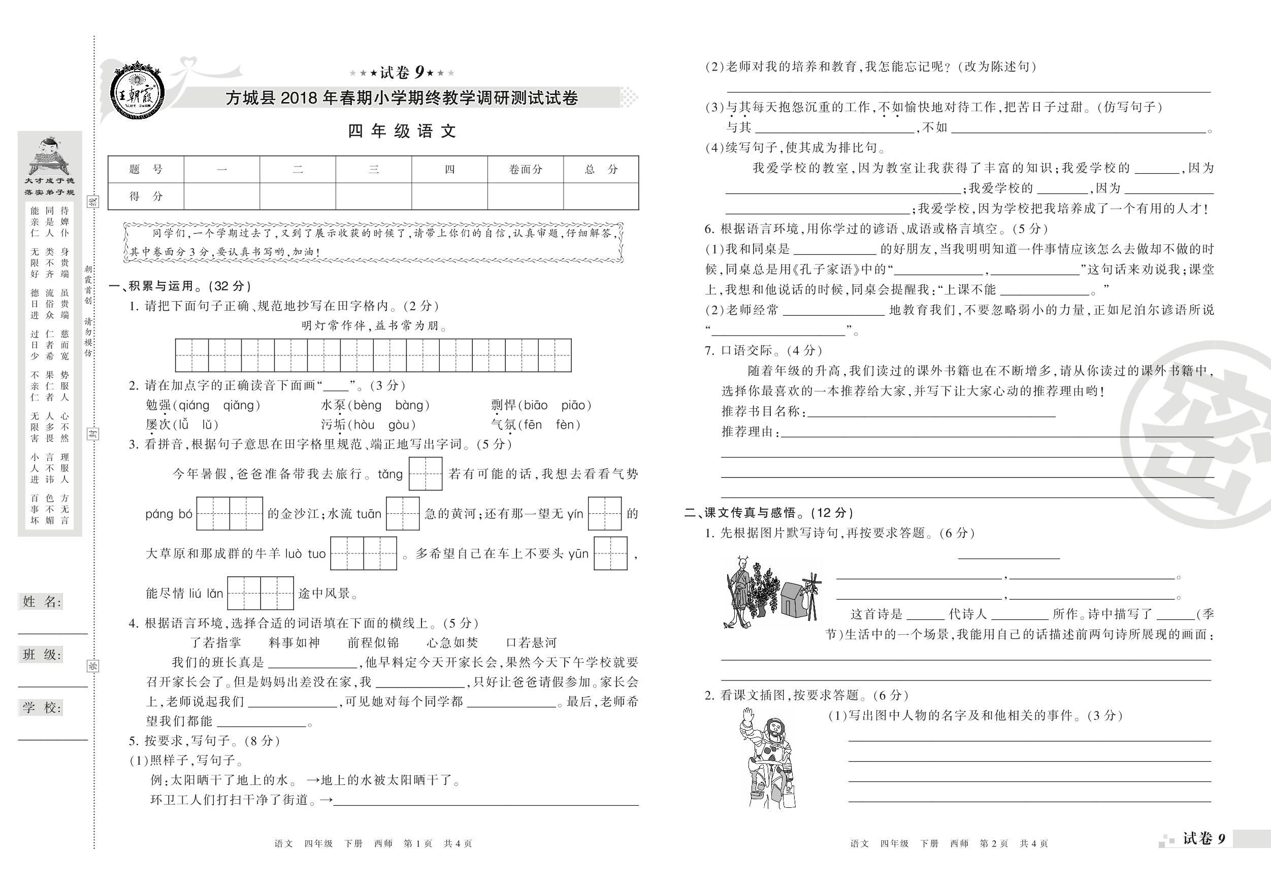 2017-2018学年第二学期南阳市方城县四年级语文试卷(西师版)【9】