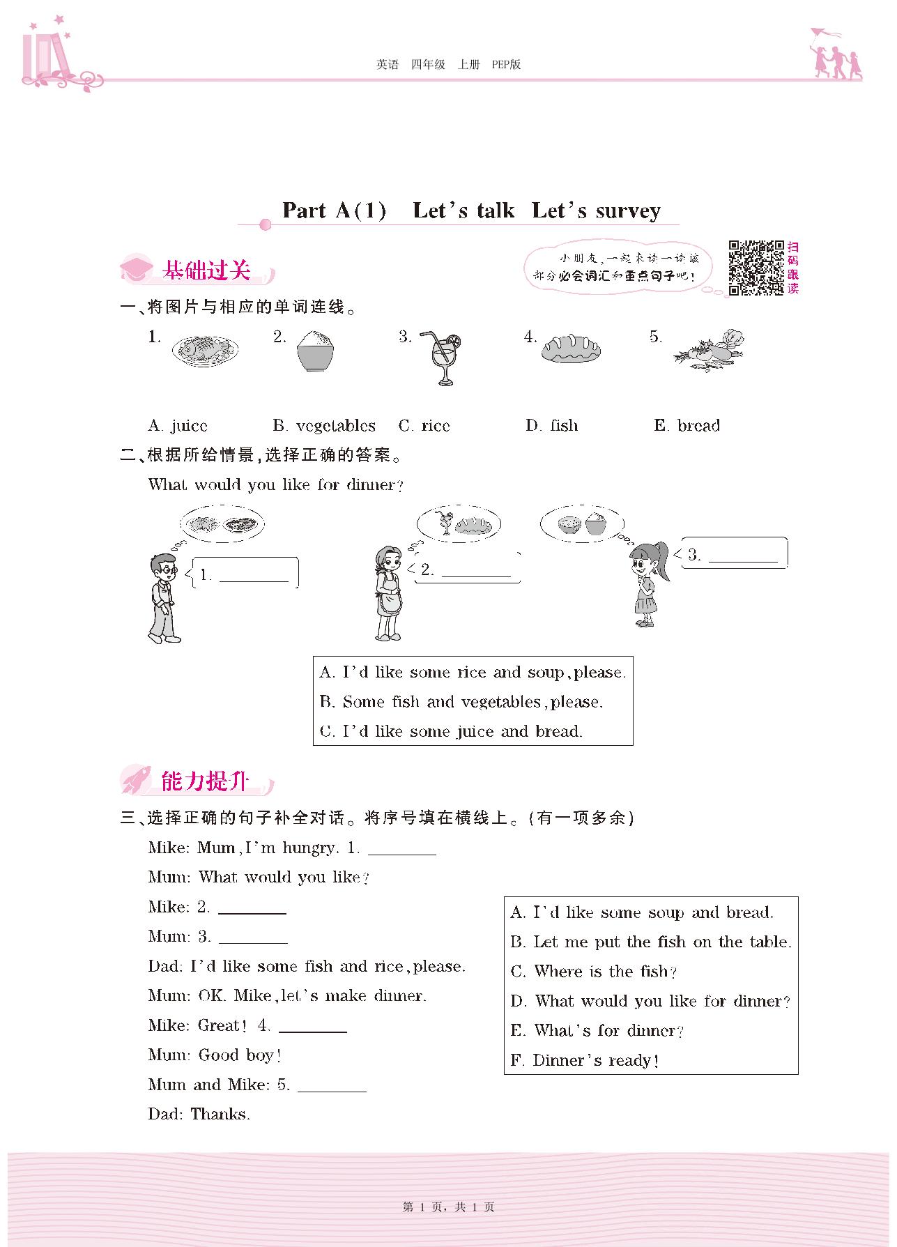 四年级英语人教PEP版(三起始)上册课时作业