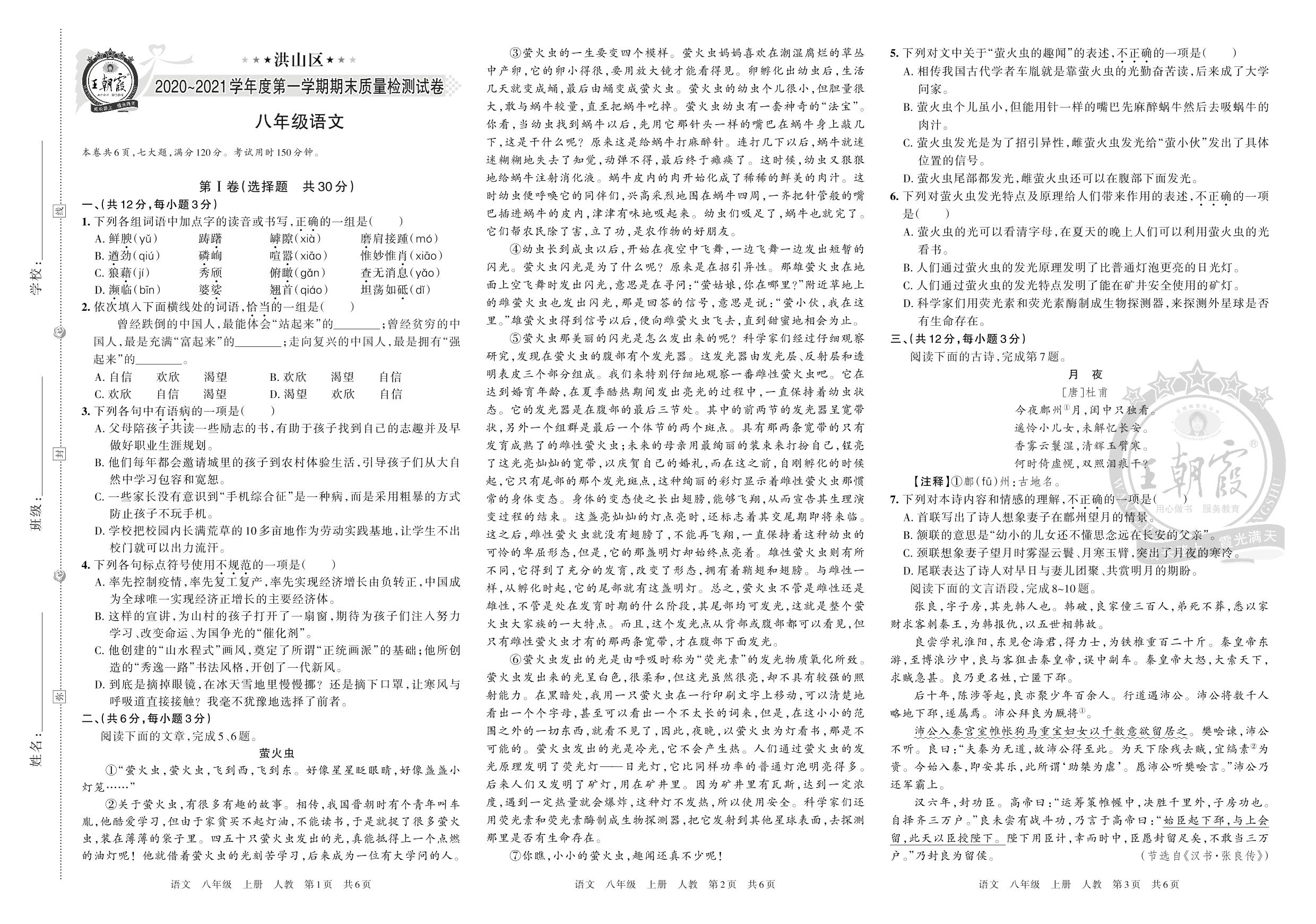 洪山区2020~2021学年度第一学期八年级语文期末质量检测试卷