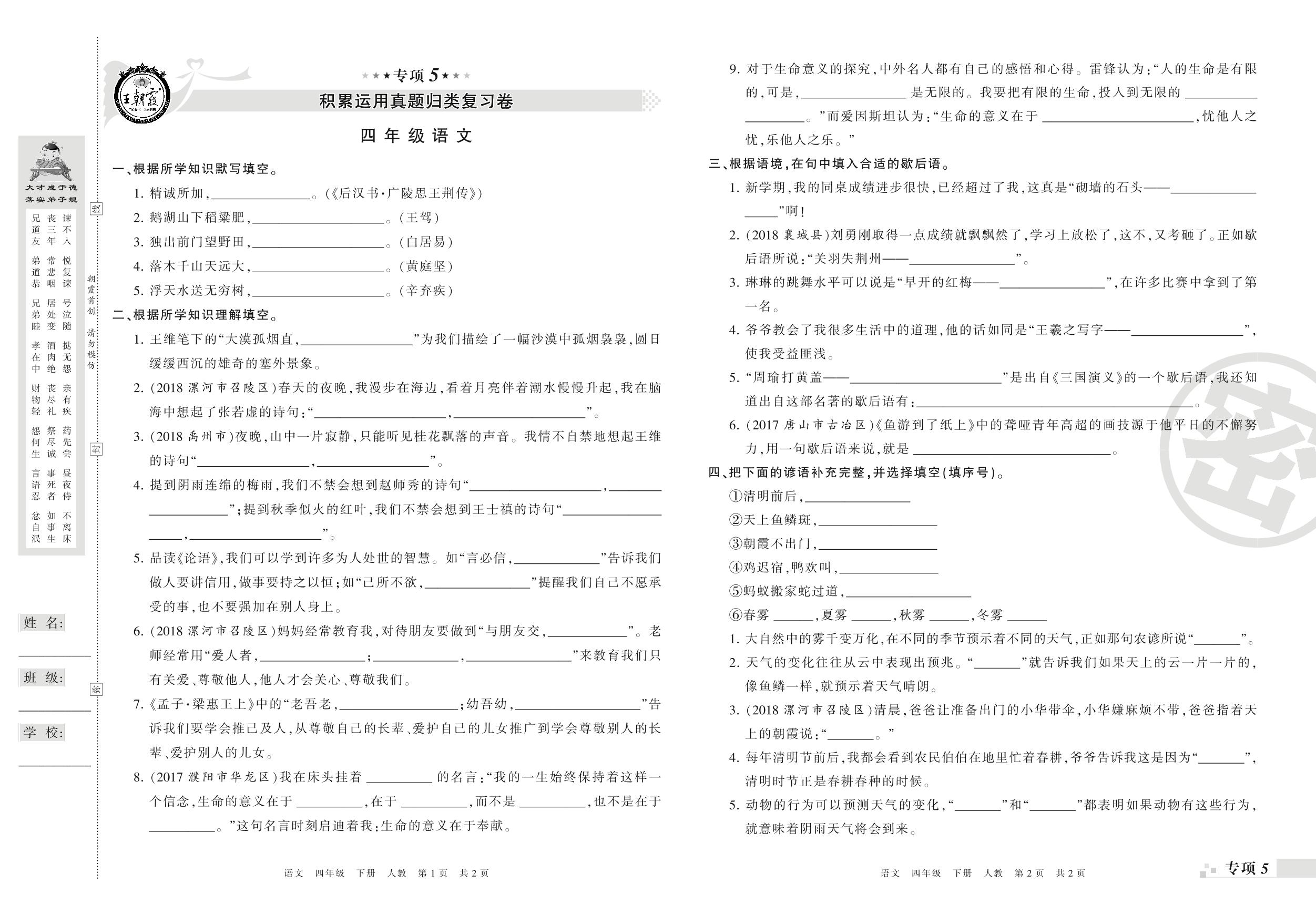王朝霞期末专项卷——积累运用、课内阅读真题归类复习四年级下册语文(人教版)_R210801201720【0】