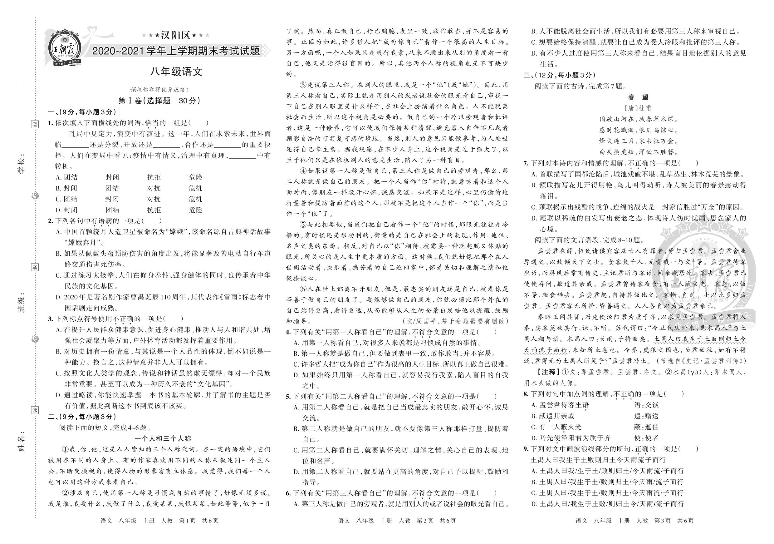 汉阳区2020~2021学年上学期八年级语文期末考试试题