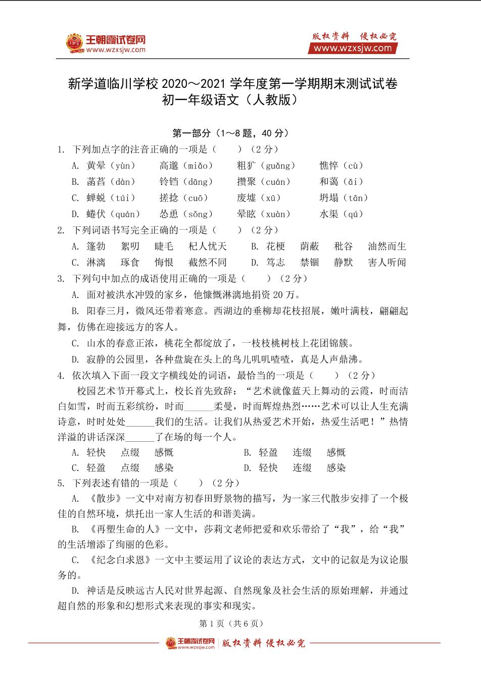 北京市昌平区新学道临川学校2020~2021学年七年级上学期期末考试语文试题(人教版)