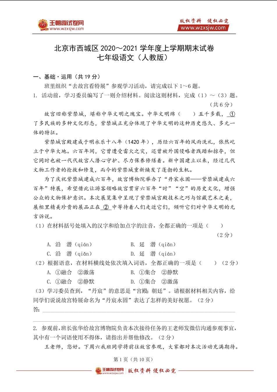 北京市西城区2020~2021学年度七年级上学期期末语文试卷(人教版)
