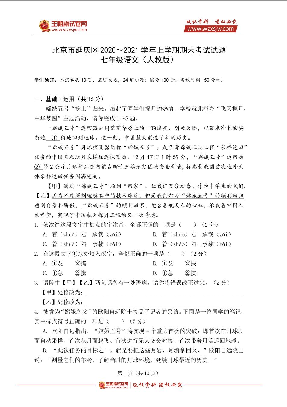 北京市延庆区2020~2021学年七年级上学期期末考试语文试题(人教版)