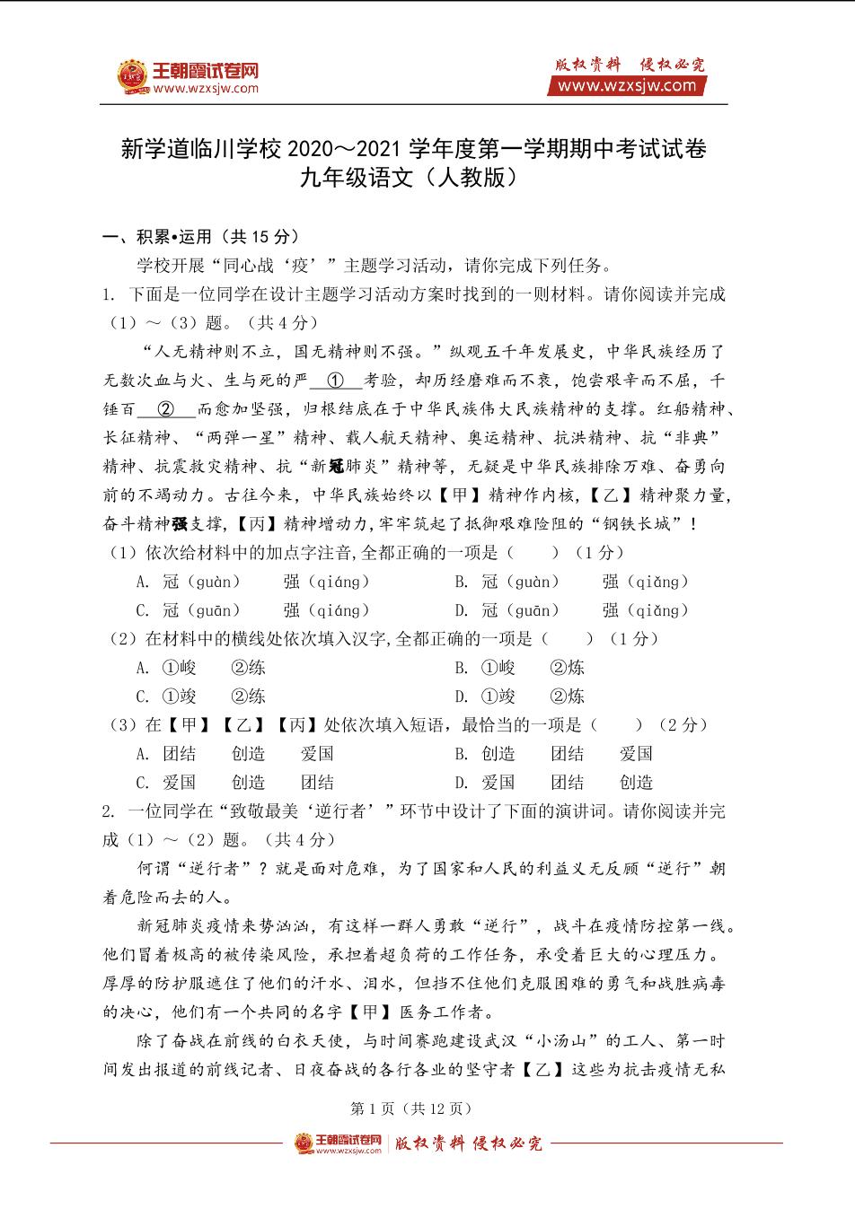 新学道临川学校2020~2021学年度第一学期期中考试试卷九年级语文(人教版)