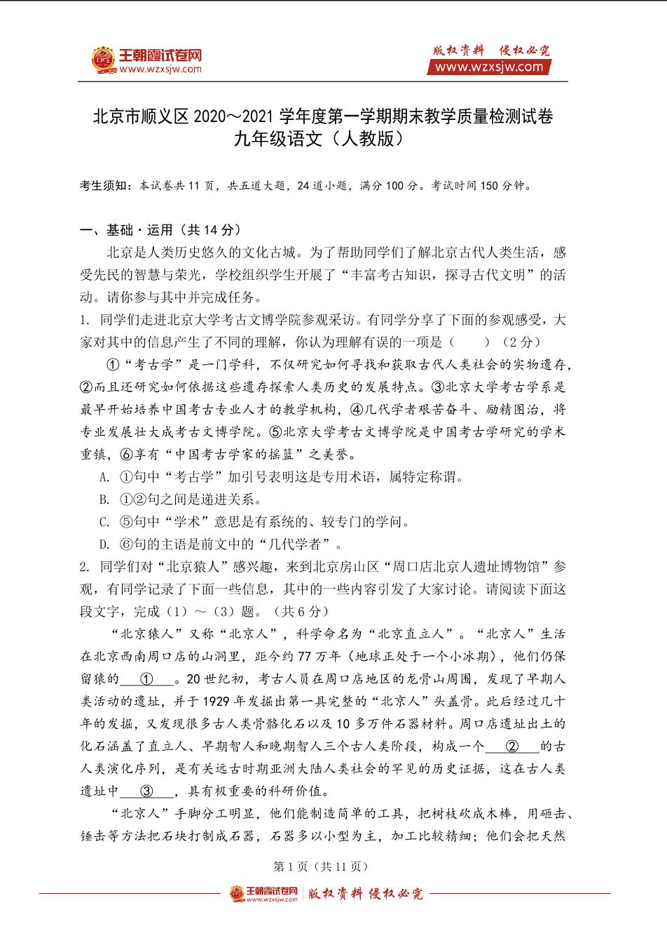 北京市顺义区2020~2021学年度第一学期期末教学质量检测试卷九年级语文(人教版)