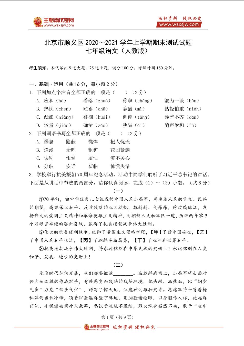 北京市顺义区2020~2021学年七年级上学期期末测试语文试题(人教版)