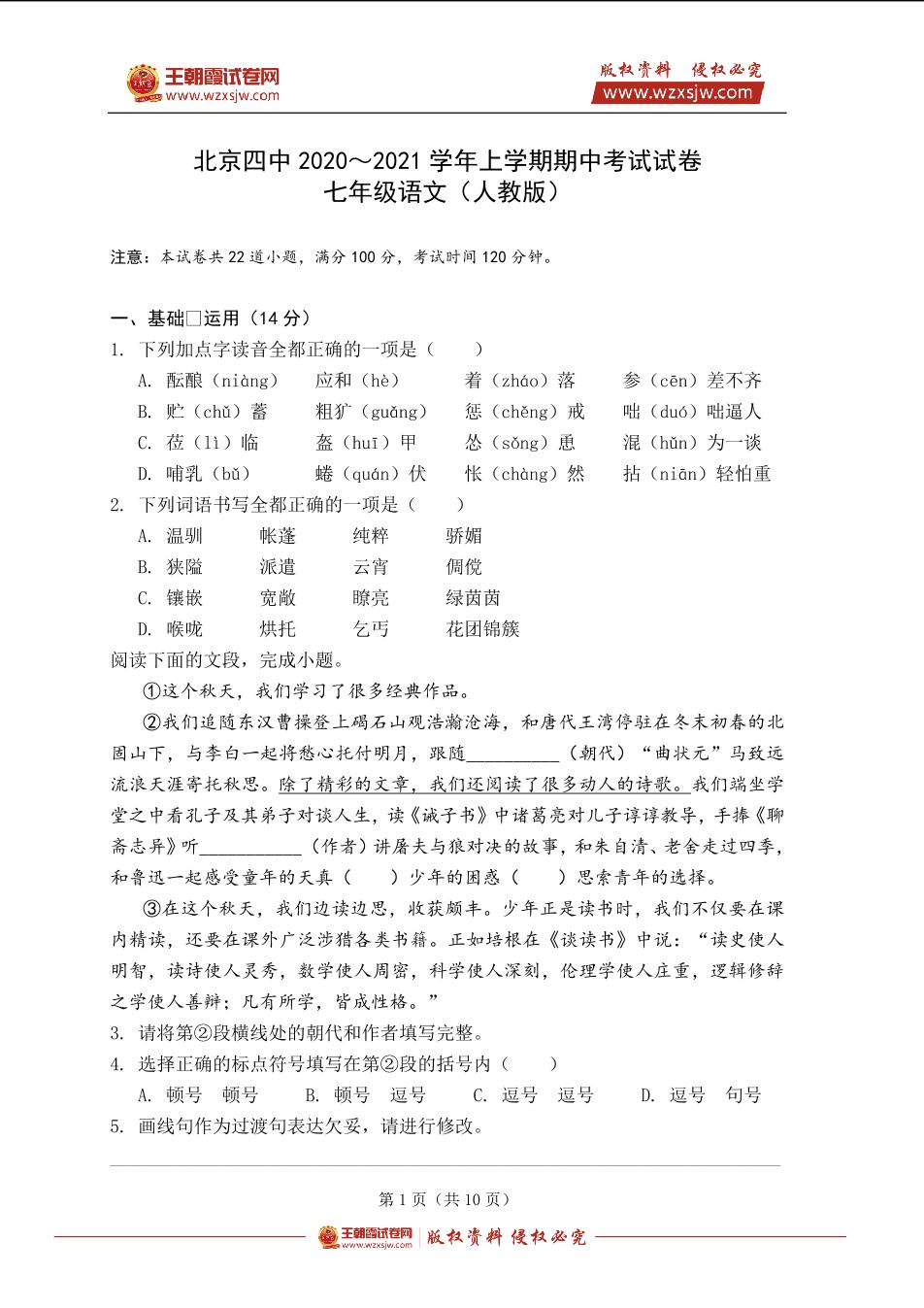 北京市四中2020~2021学年上学期期中考试试卷七年级语文(人教版)