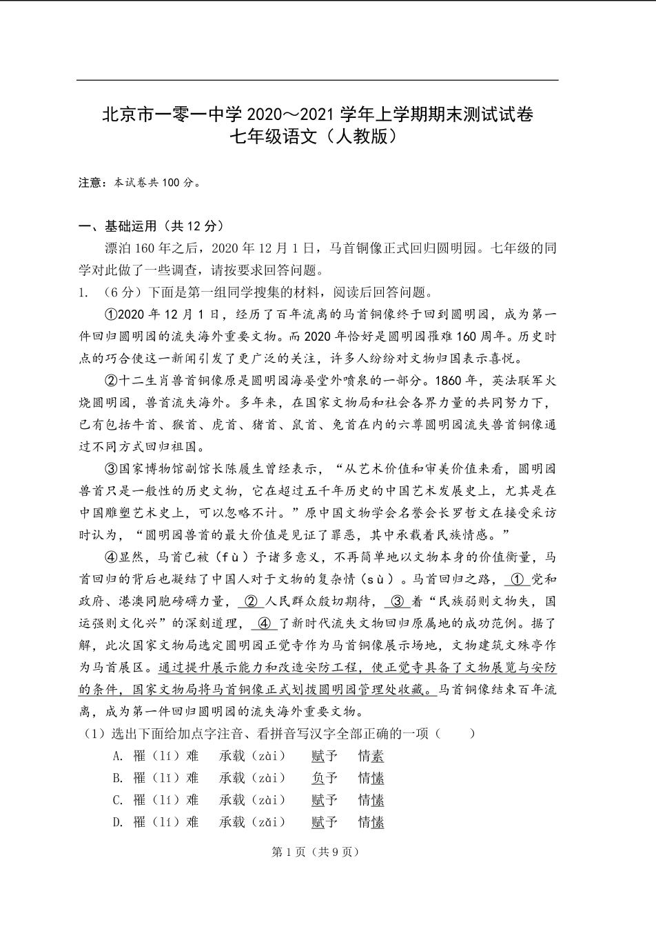 北京市101中学2020~2021学年七年级上学期期末测试语文试卷(人教版)