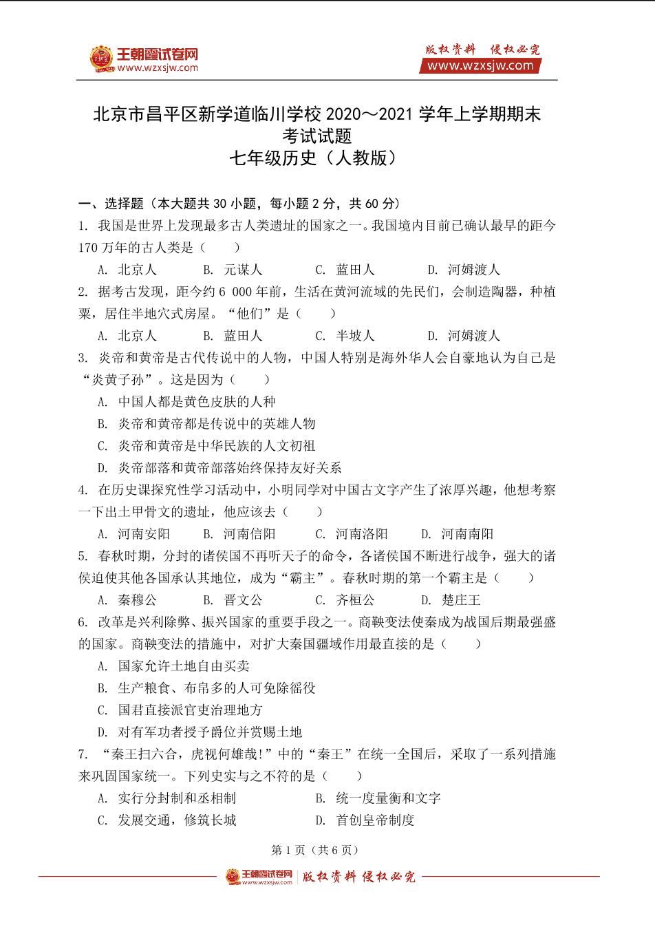 北京市昌平区新学道临川学校2020~2021学年七年级上学期期末考试历史试题(人教版)