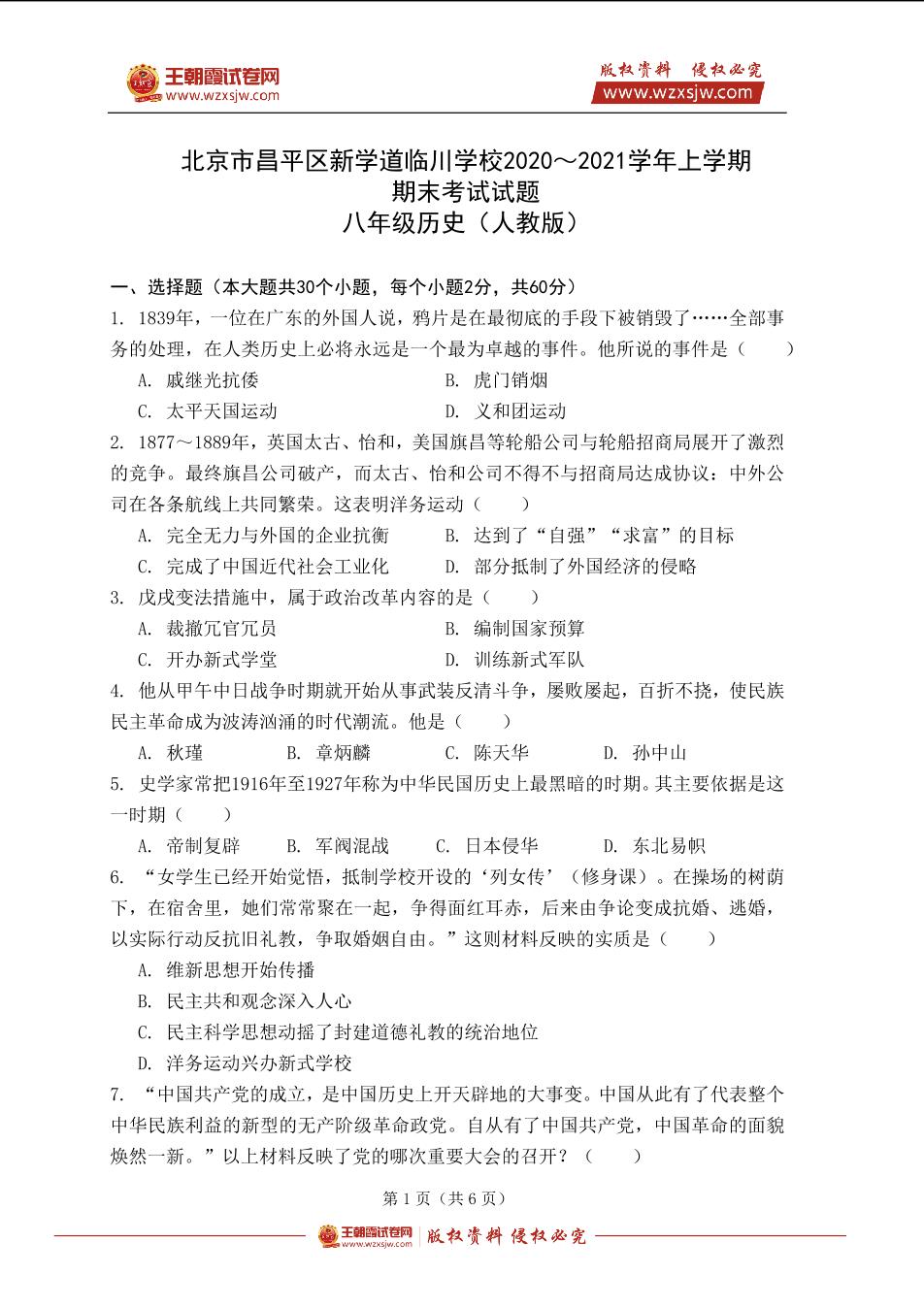 北京市昌平区新学道临川学校2020~2021学年八年级上学期期末考试历史试题(人教版)