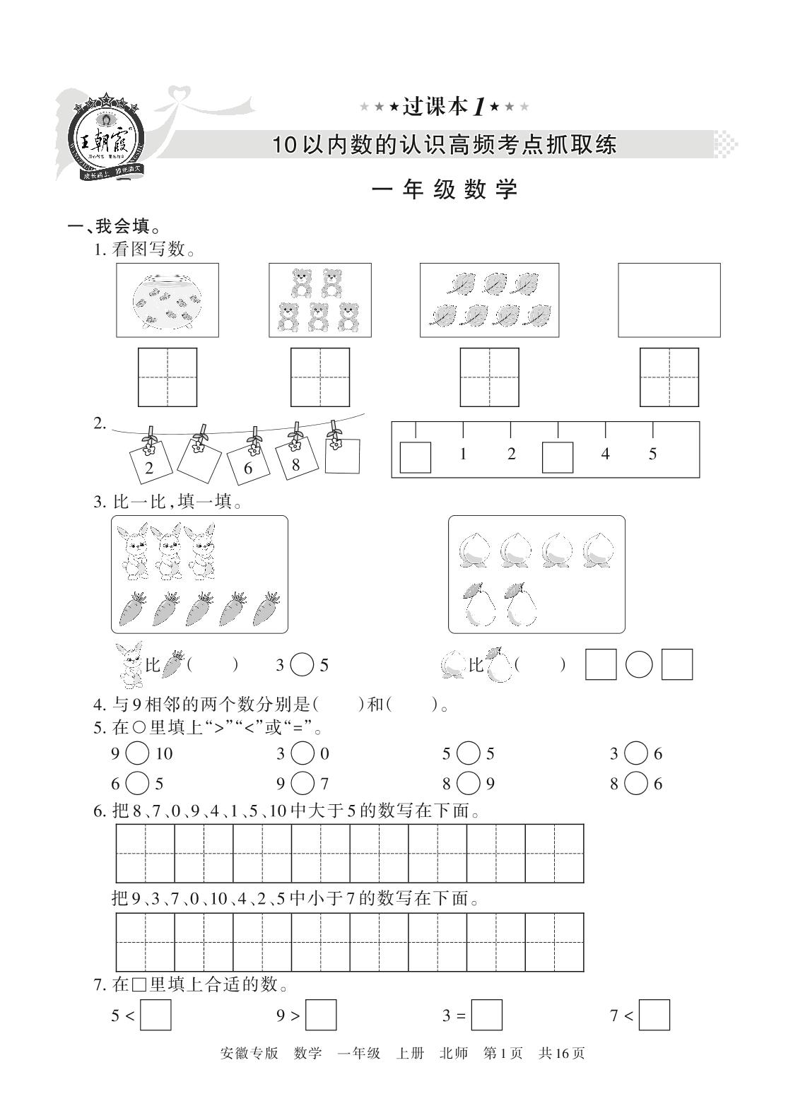 王朝霞期末过课本——10以内数的认识高频考点抓取练一年级上册数学(北师版)【1】