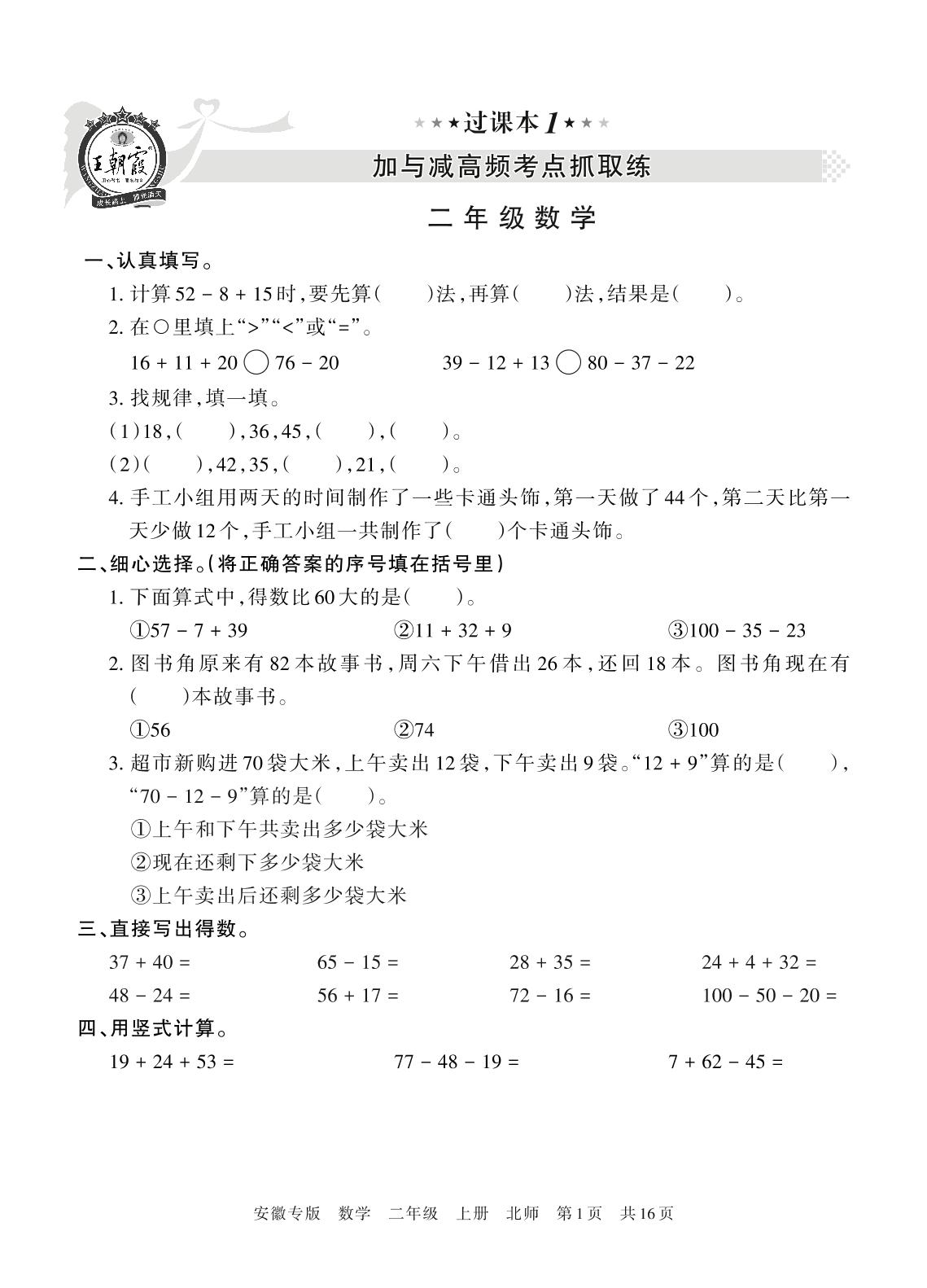 王朝霞期末过课本——加与减高频考点抓取练二年级上册数学(北师版)【1】