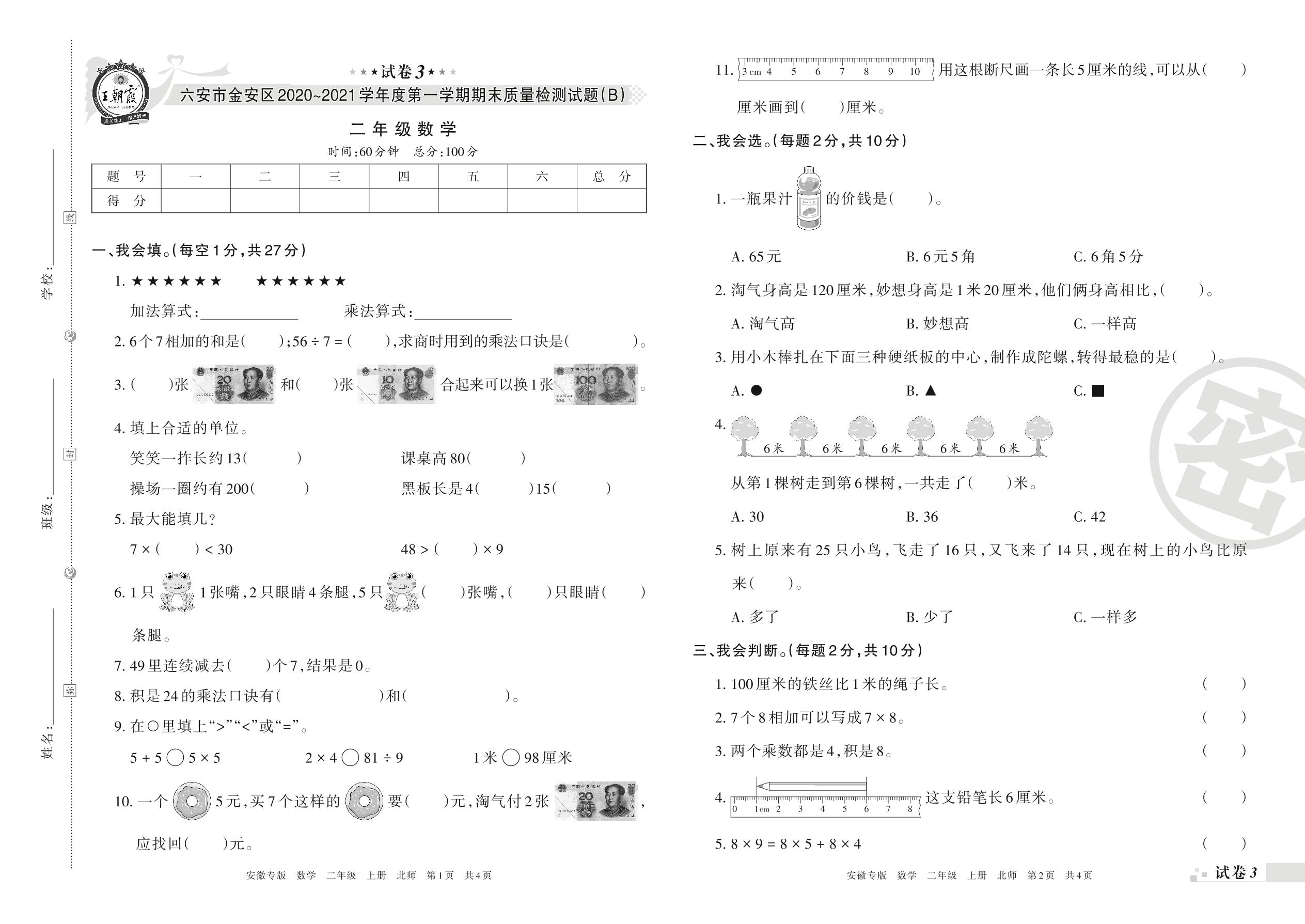 六安市金安区2020~2021学年度第一学期期末质量检测试题(B)二年级数学(北师版)【3】