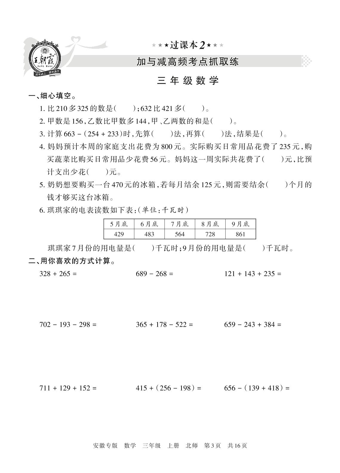 王朝霞期末过课本——加与减高频考点抓取练三年级上册数学(北师版)【2】