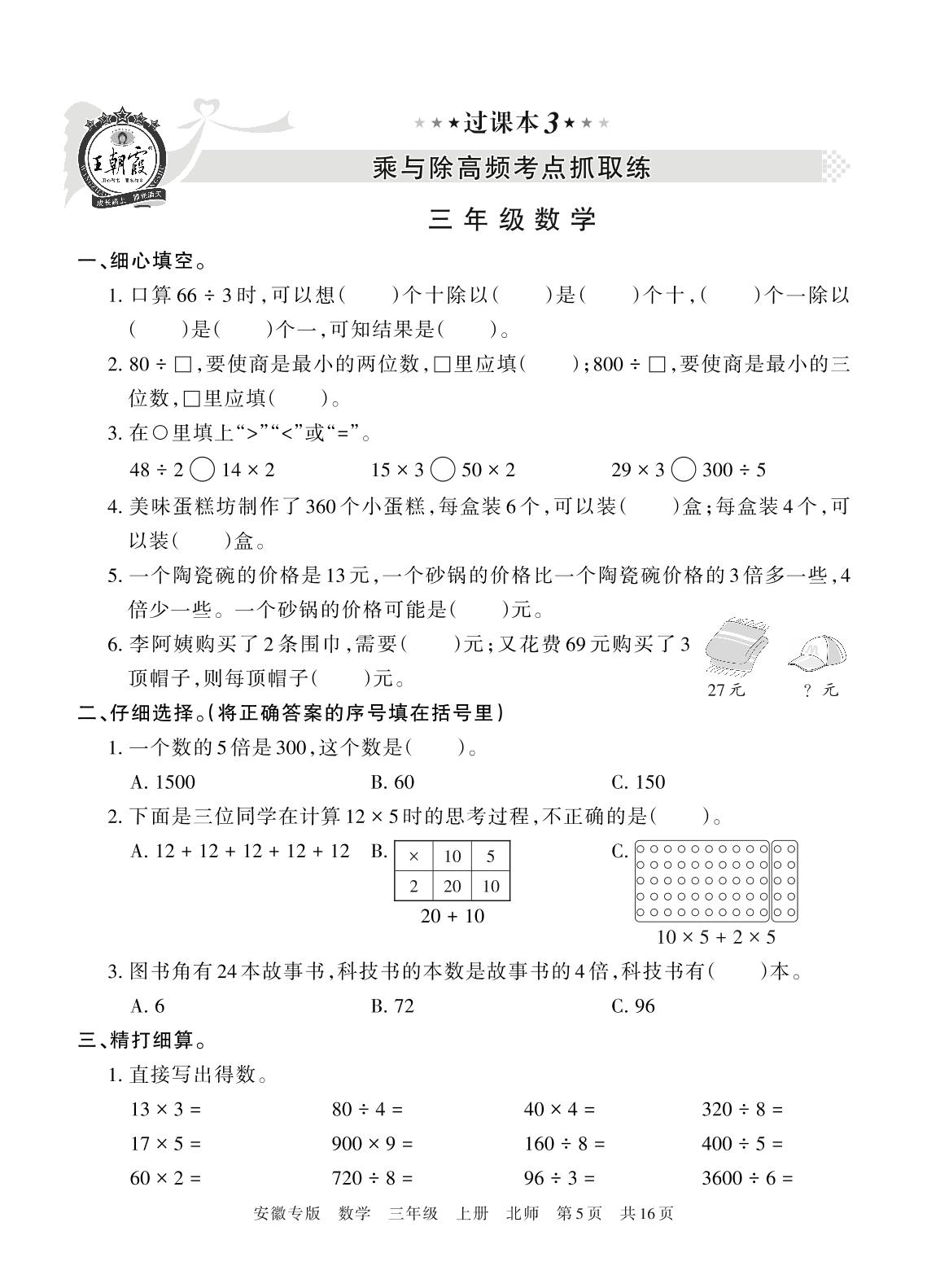 王朝霞期末过课本——乘与除高频考点抓取练三年级上册数学(北师版)【3】