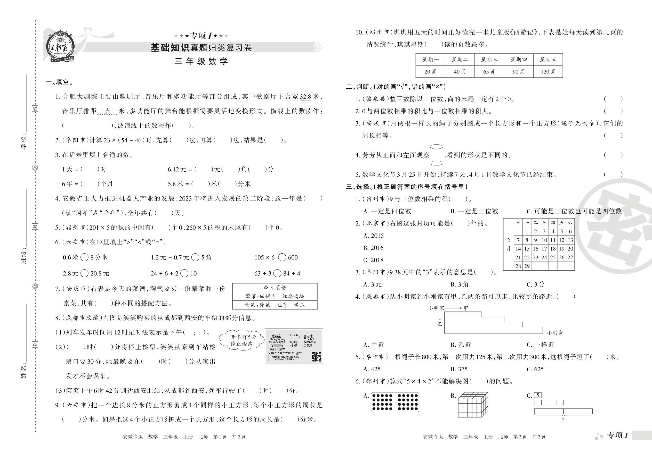 王朝霞期末专项卷——基础知识真题归类复习三年级上册数学(北师版)【1】