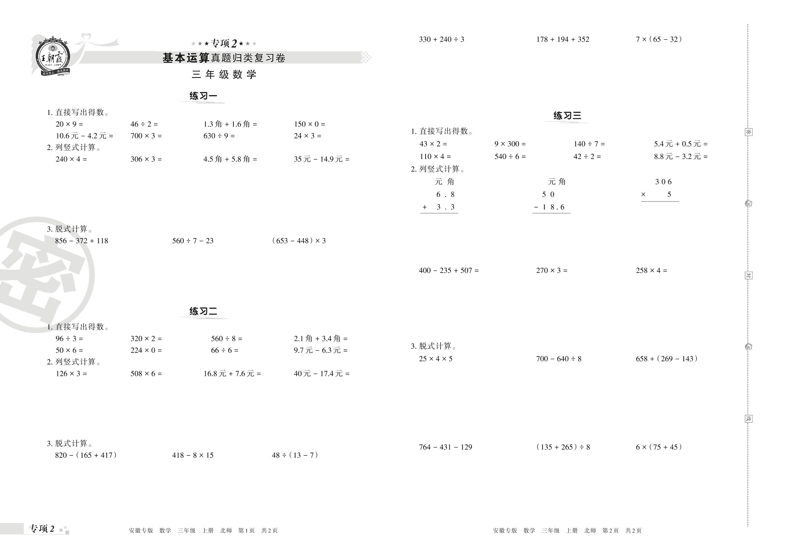 王朝霞期末专项卷——基本运算真题归类复习三年级上册数学(北师版)【2】