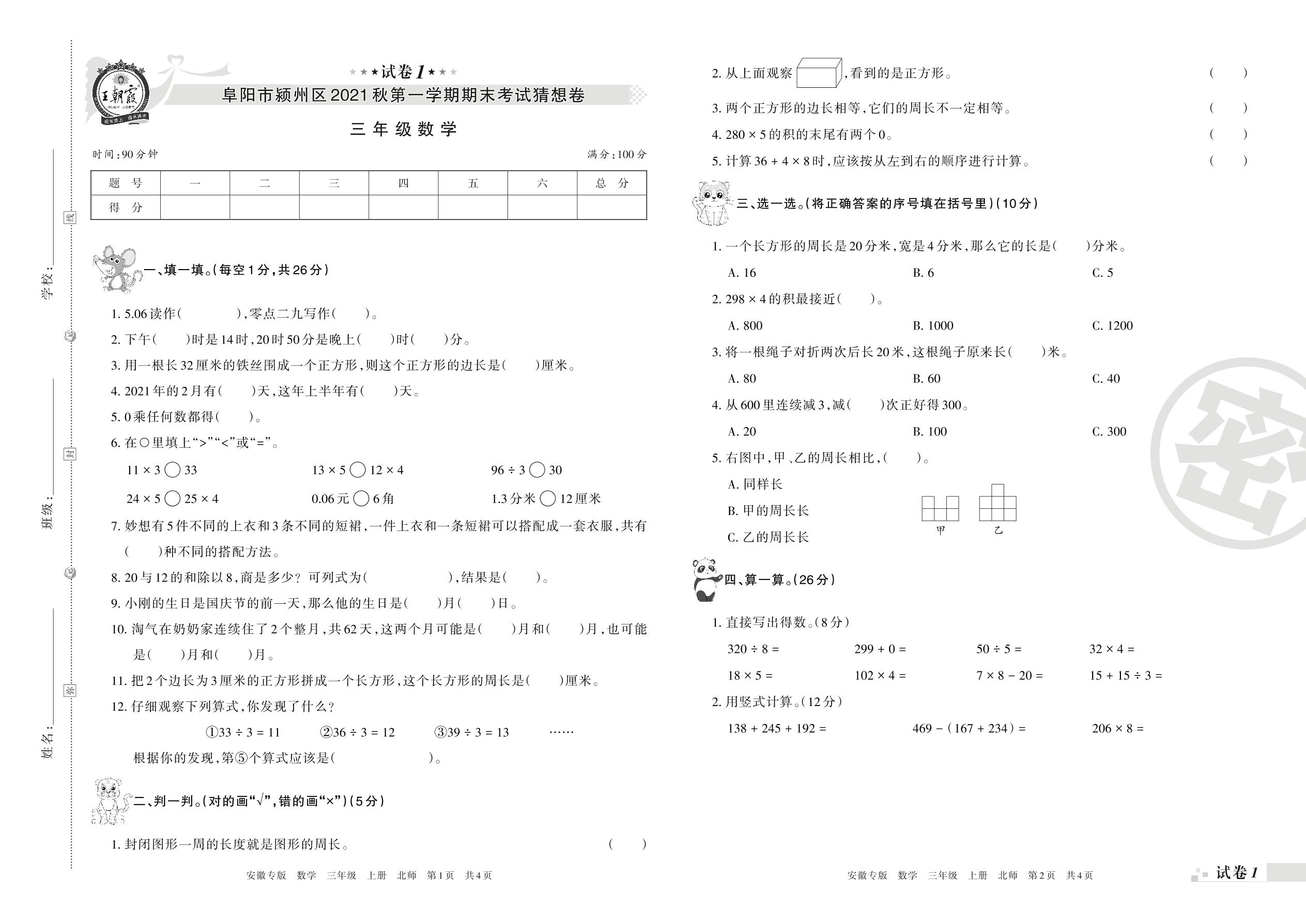 阜阳市颍州区2021秋第一学期期末考试猜想卷三年级数学(北师版)【1】