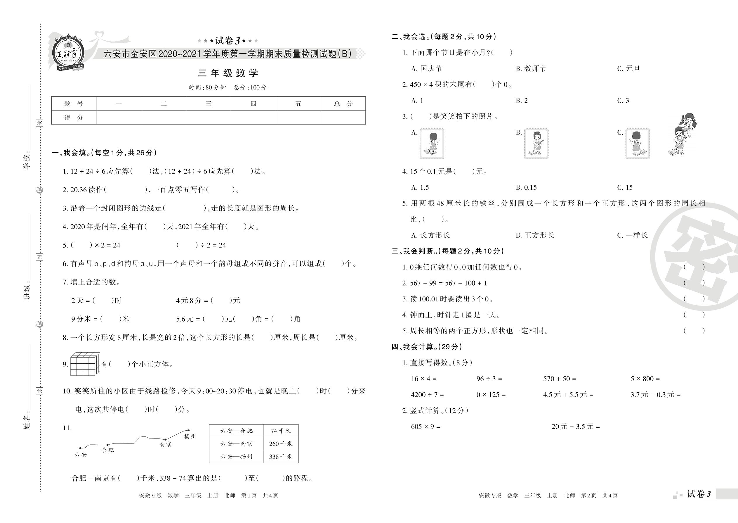 六安市金安区2020~2021学年度第一学期期末质量检测试题(B)三年级数学(北师版)【3】