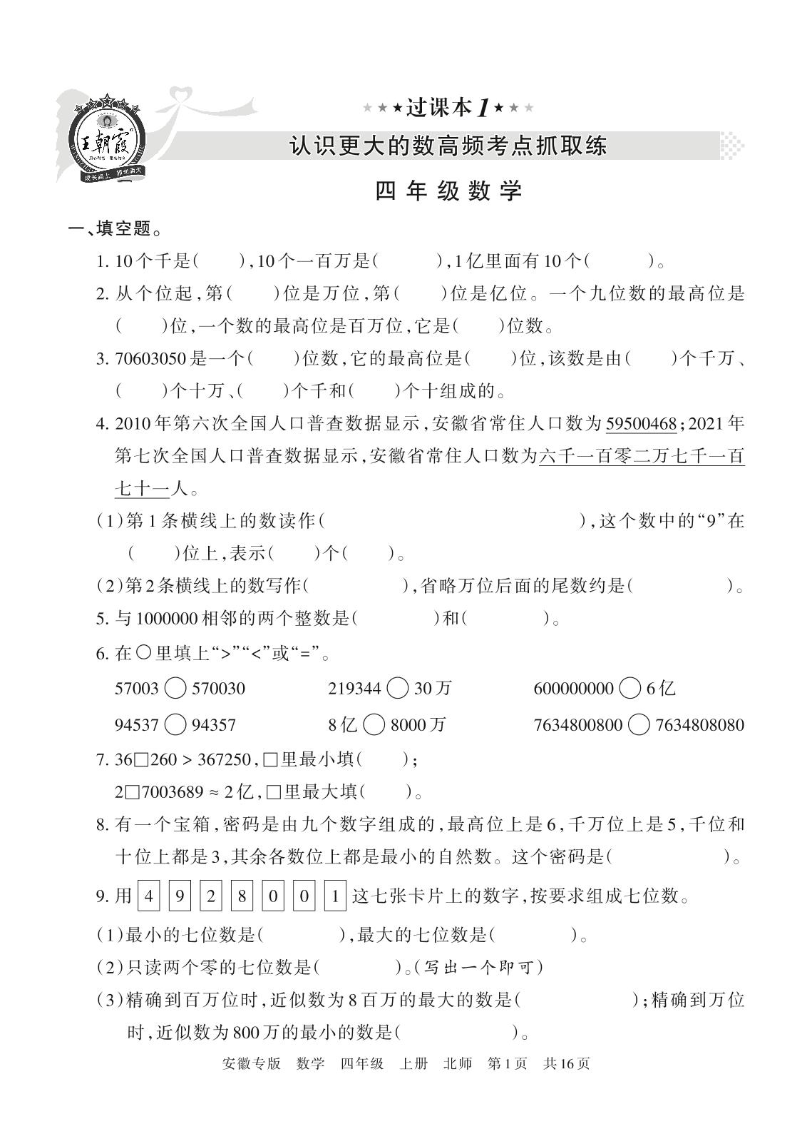 王朝霞期末过课本——认识更大的数高频考点抓取练四年级上册数学(北师版)【1】