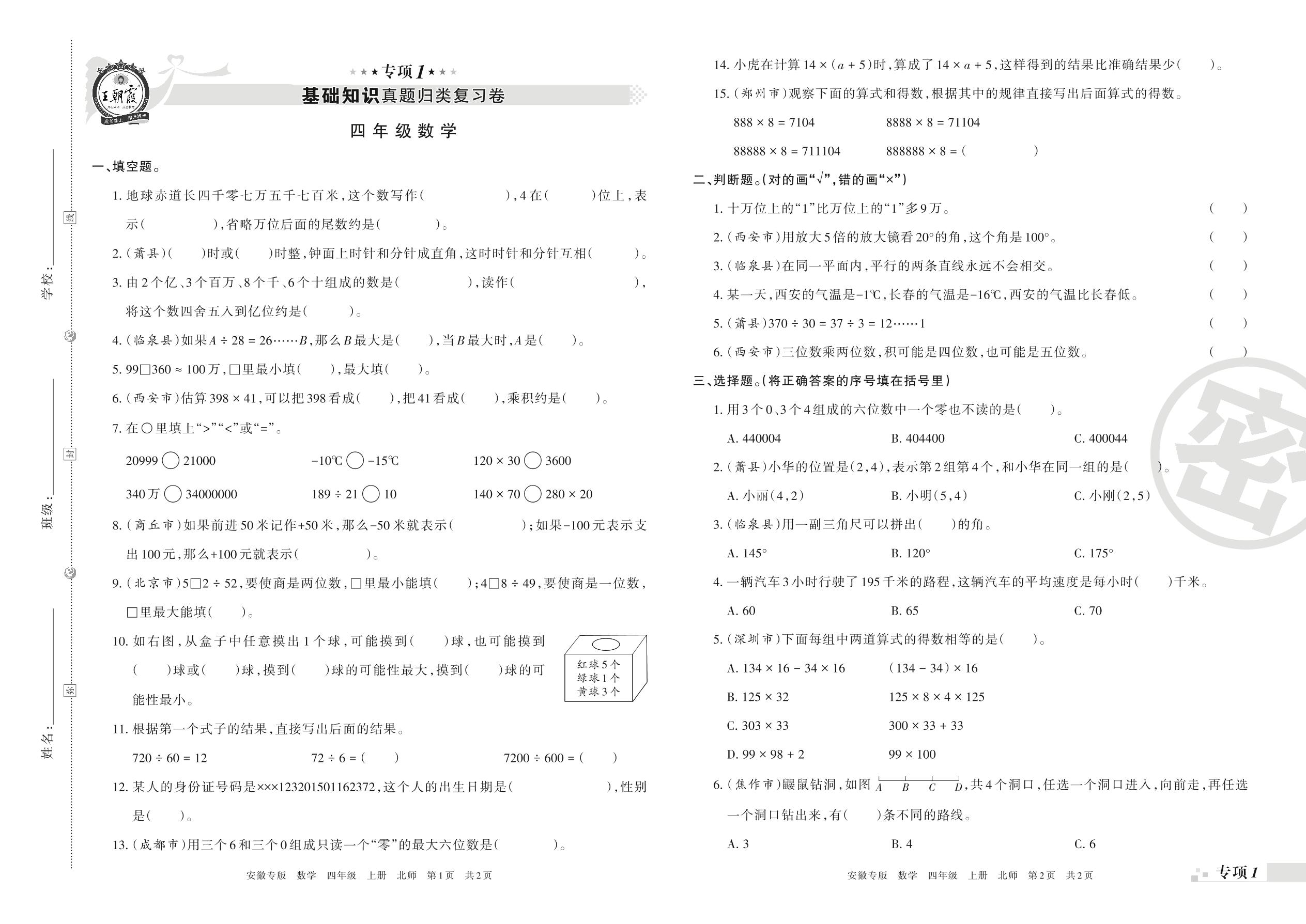 王朝霞期末专项卷——基础知识真题归类复习四年级上册数学(北师版)【1】