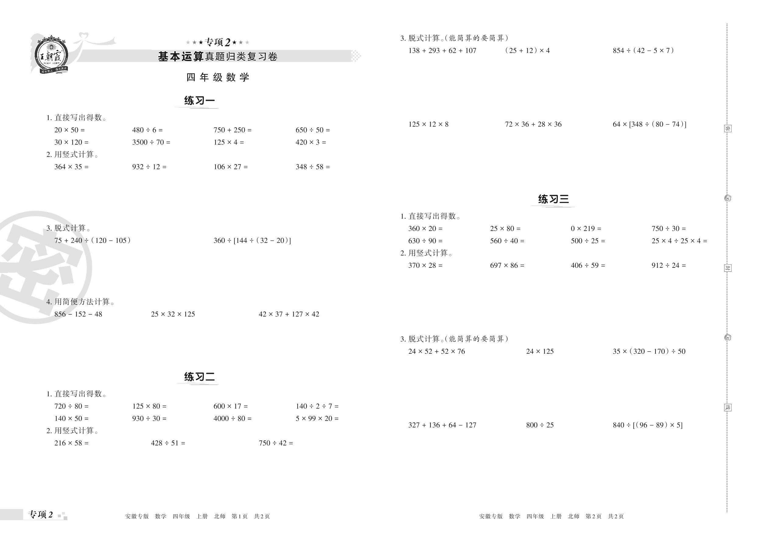 王朝霞期末专项卷——基本运算真题归类复习四年级上册数学(北师版)【2】