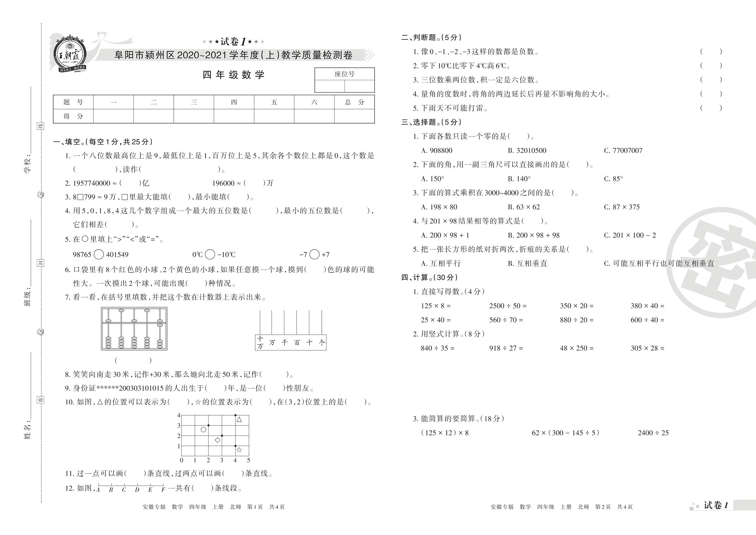 阜阳市颍州区2020~2021学年度(上)教学质量检测卷四年级数学(北师版)【1】