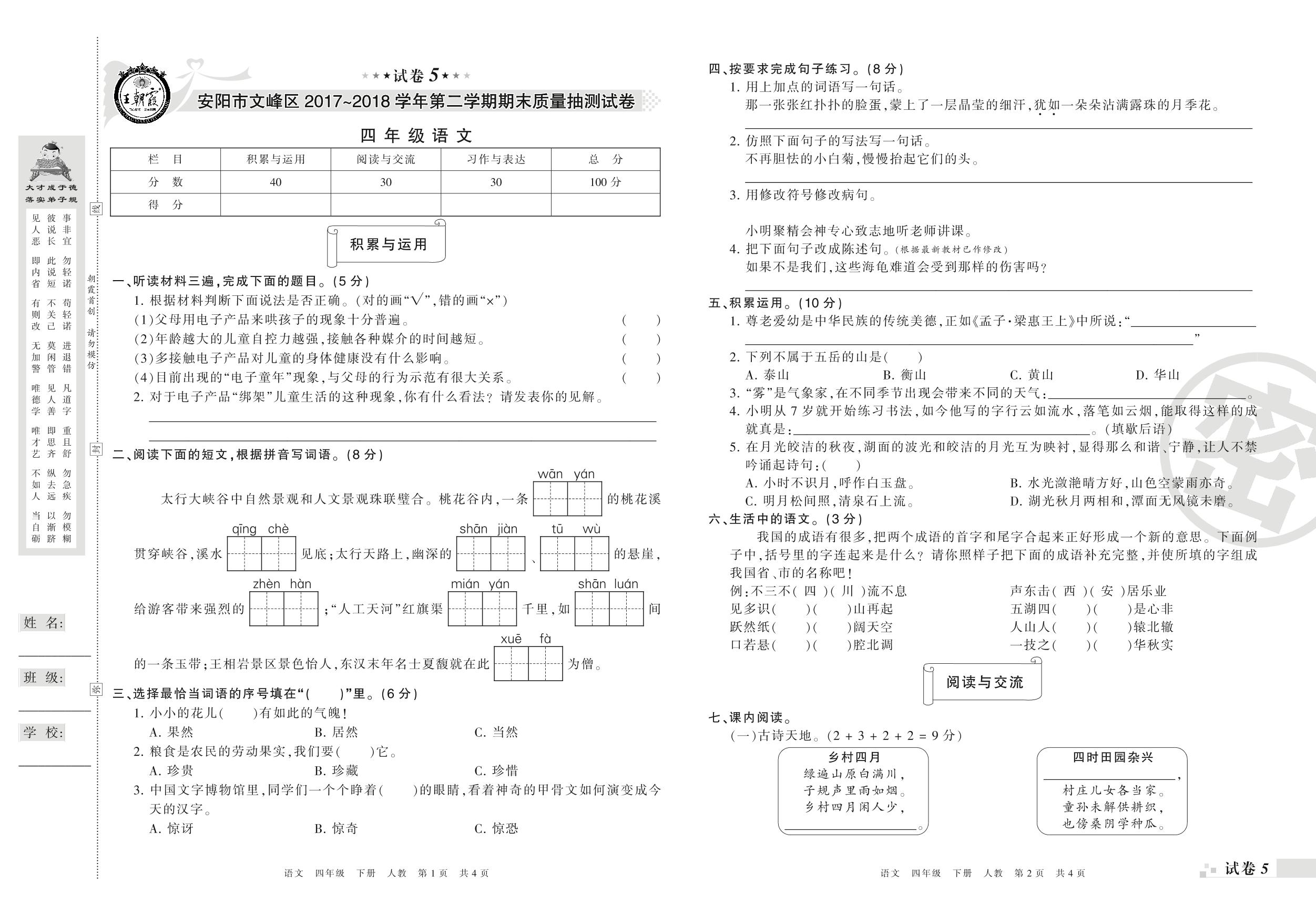 2017-2018学年第二学期安阳市文峰区四年级语文试卷(人教版)【5】