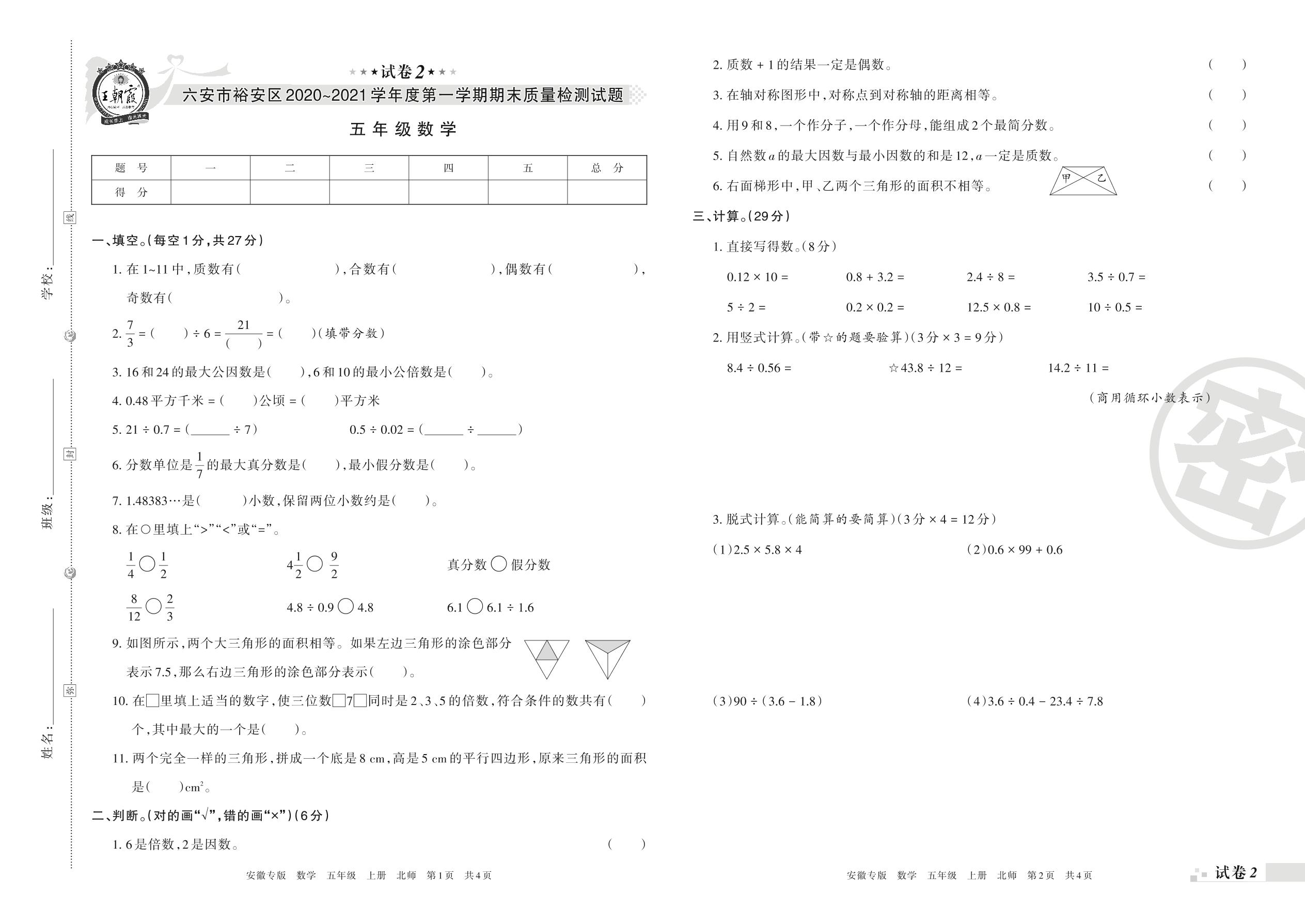 六安市裕安区2020~2021学年度第一学期期末质量检测试题五年级数学(北师版)【2】