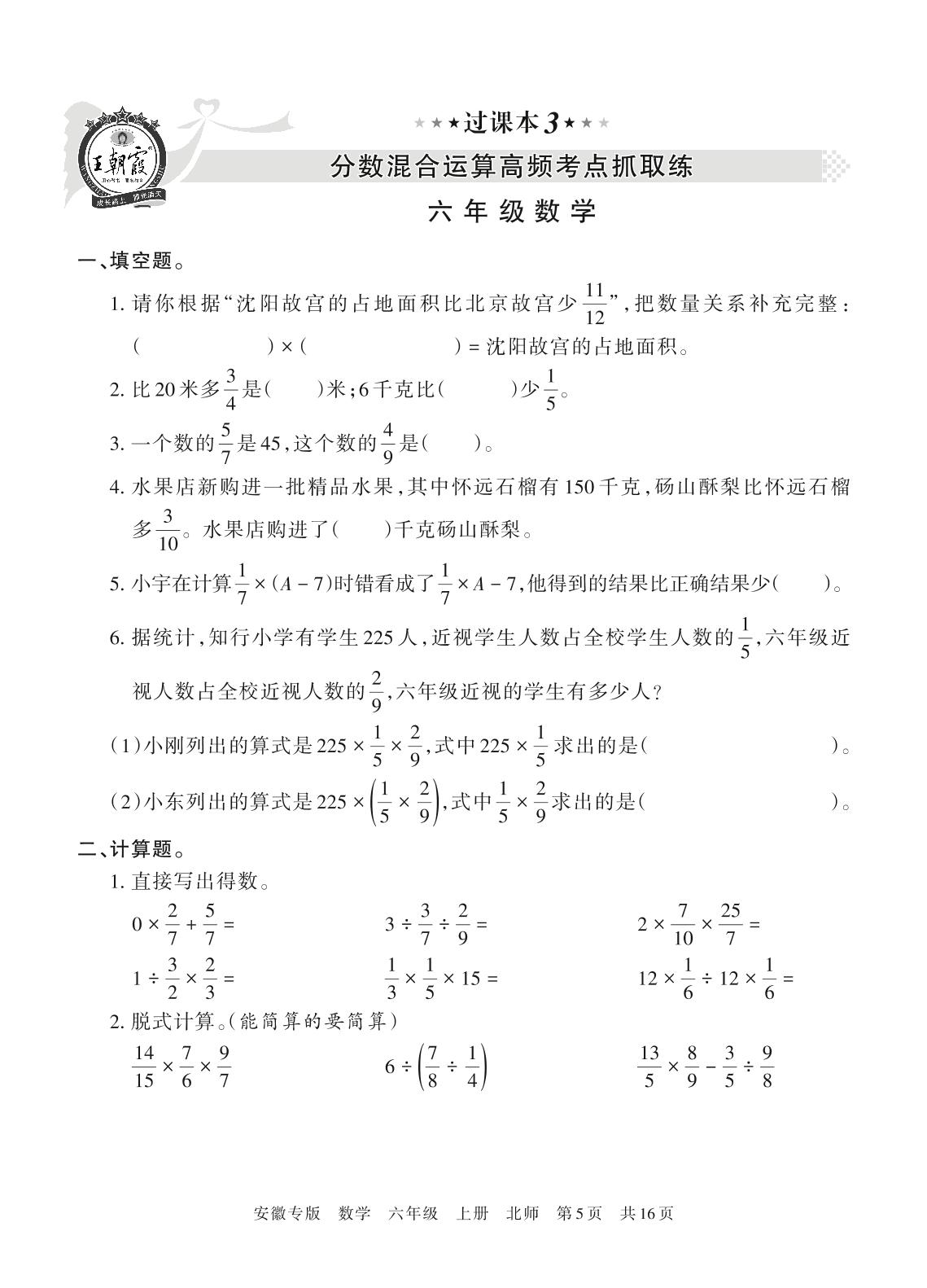 王朝霞期末过课本——分数混合运算高频考点抓取练六年级上册数学(北师版)【3】