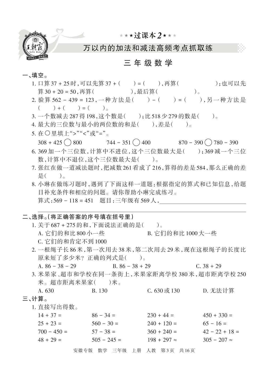 王朝霞期末过课本——万以内的加法和减法高频考点抓取练三年级上册数学(人教版)【2】