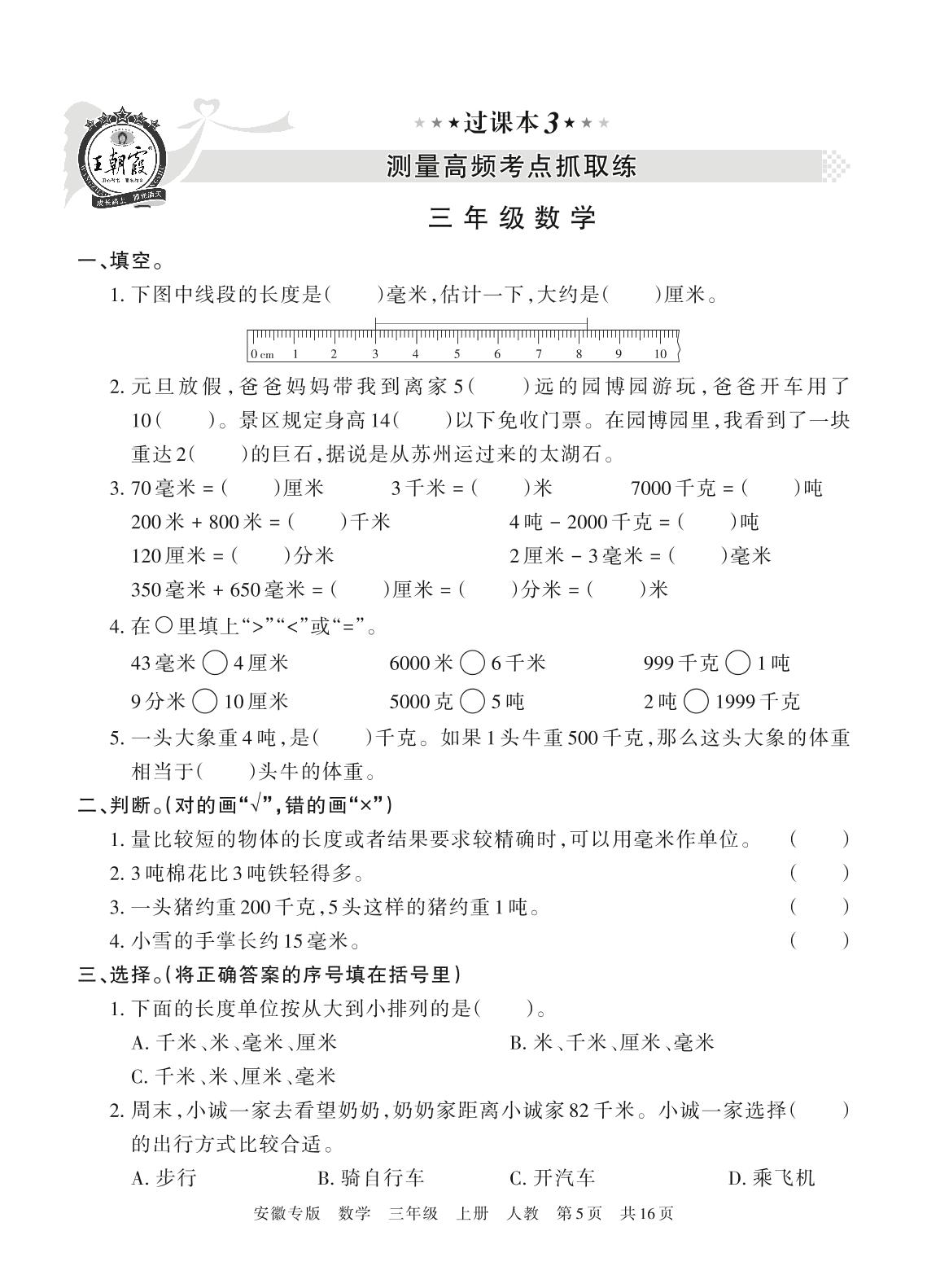 王朝霞期末过课本——测量高频考点抓取练三年级上册数学(人教版)【3】
