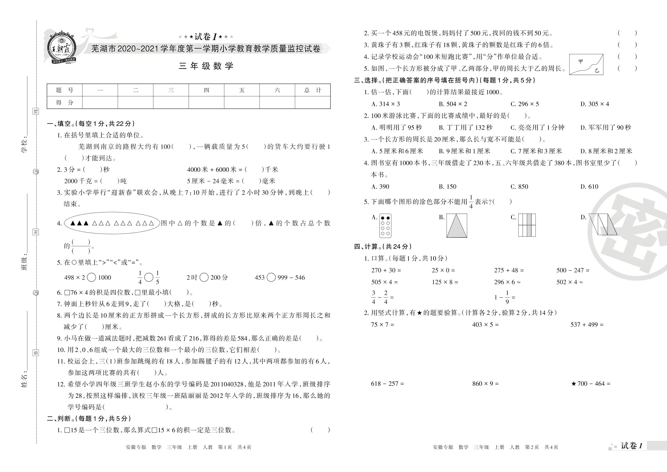 芜湖市2020~2021学年度第一学期小学教育教学质量监控试卷三年级数学(人教版)【1】